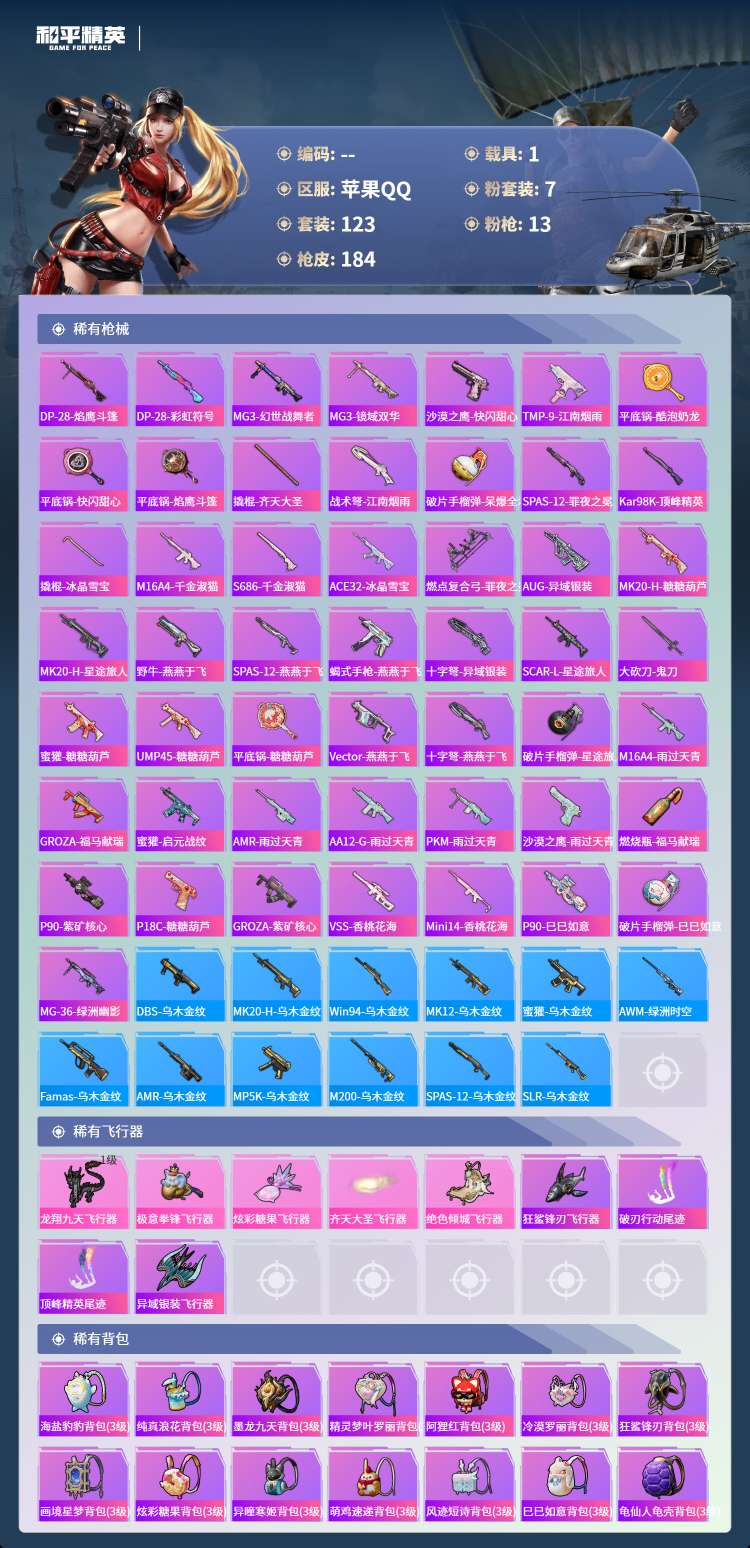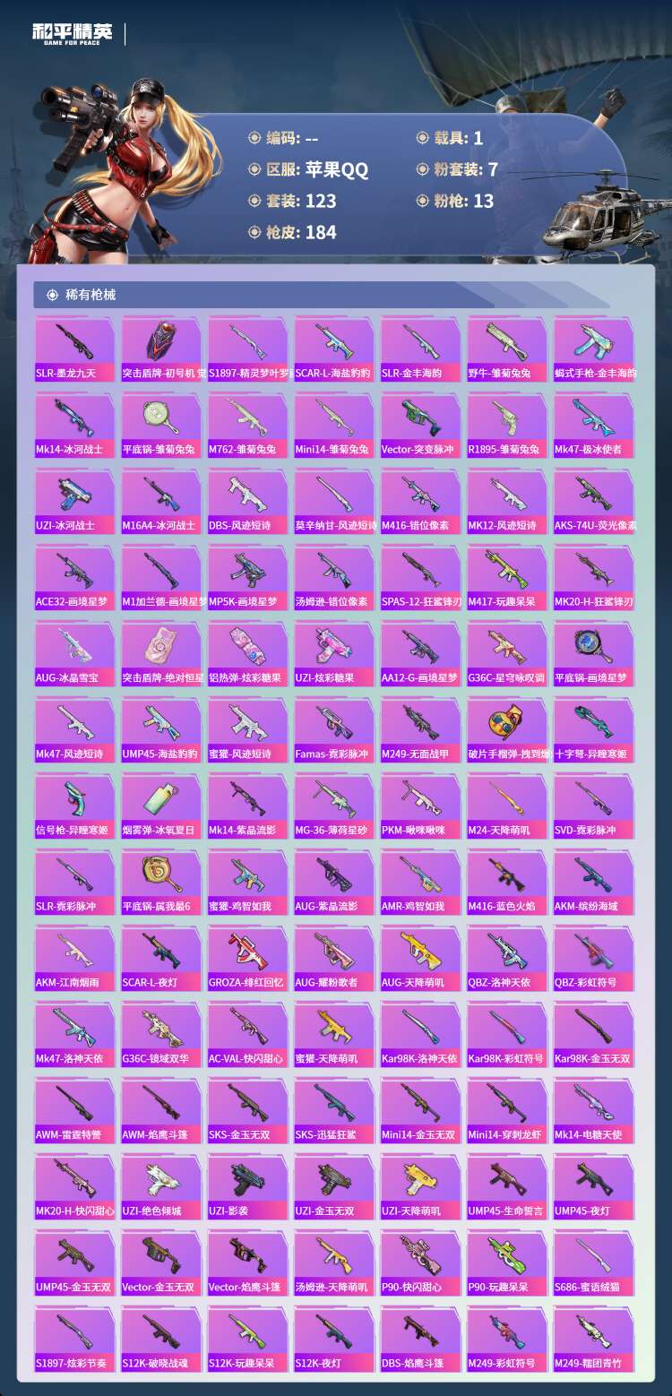 hs62829苹果手Q-7王牌印记-有战神框-1红装-7粉装-13特效枪-1载具-58183热力值-