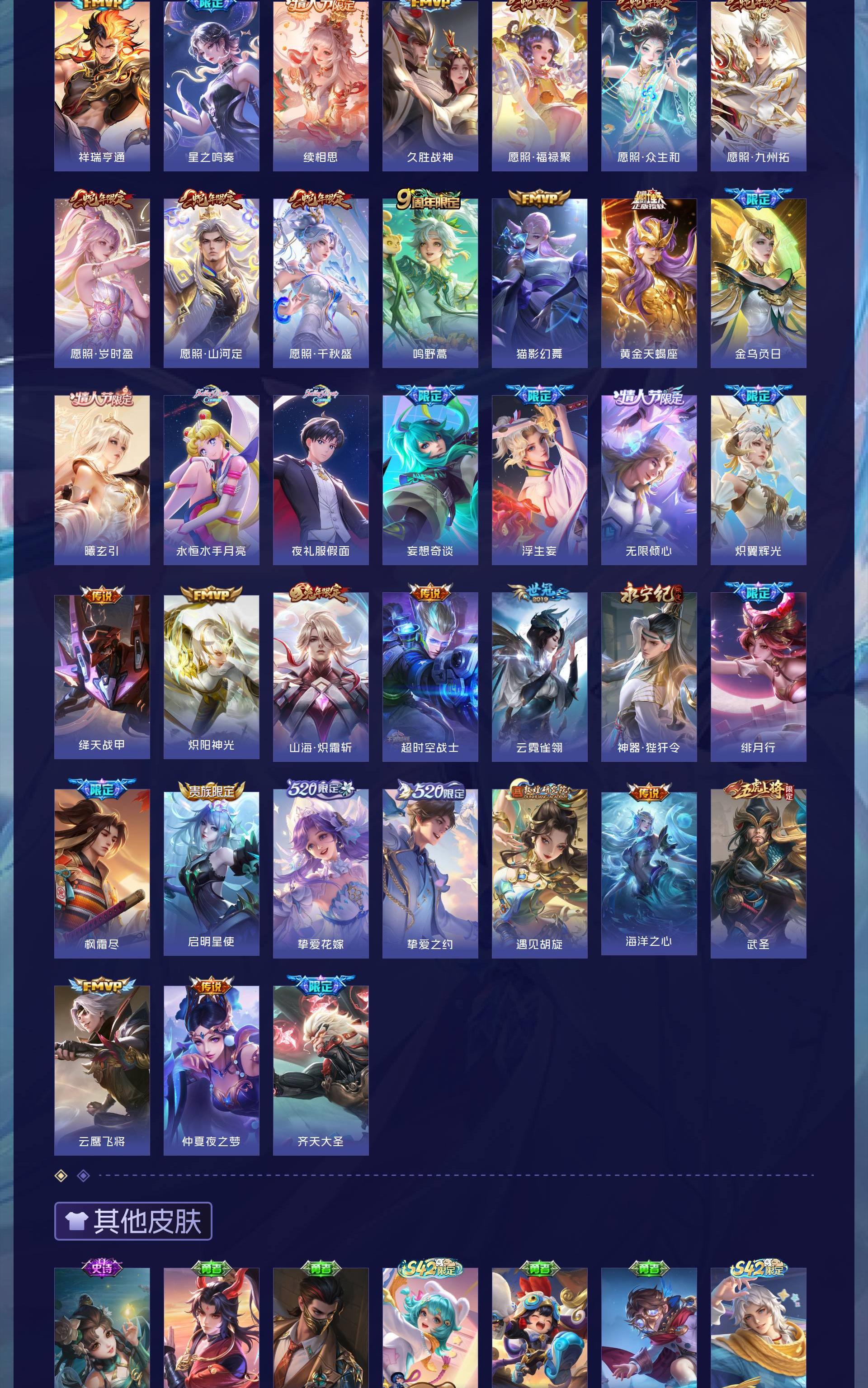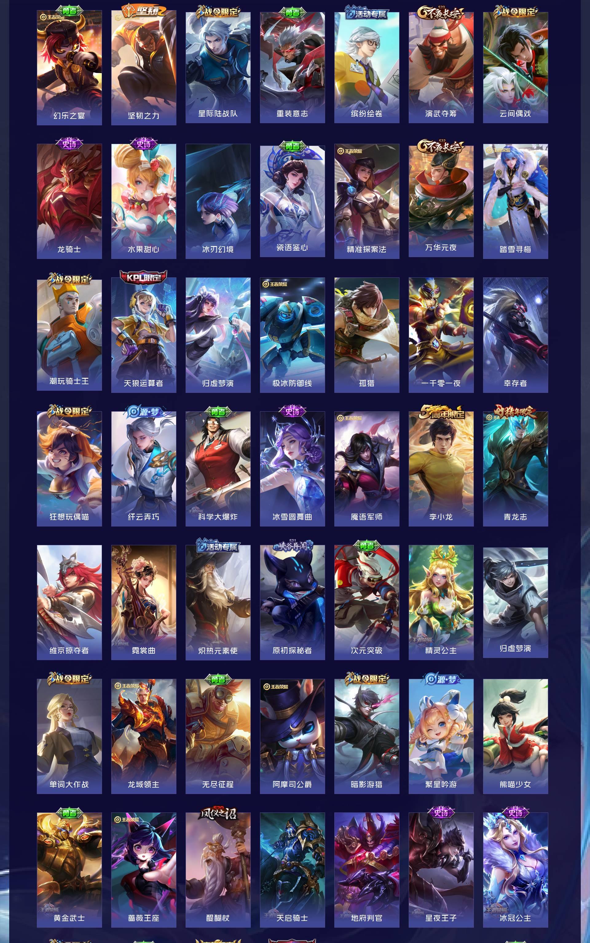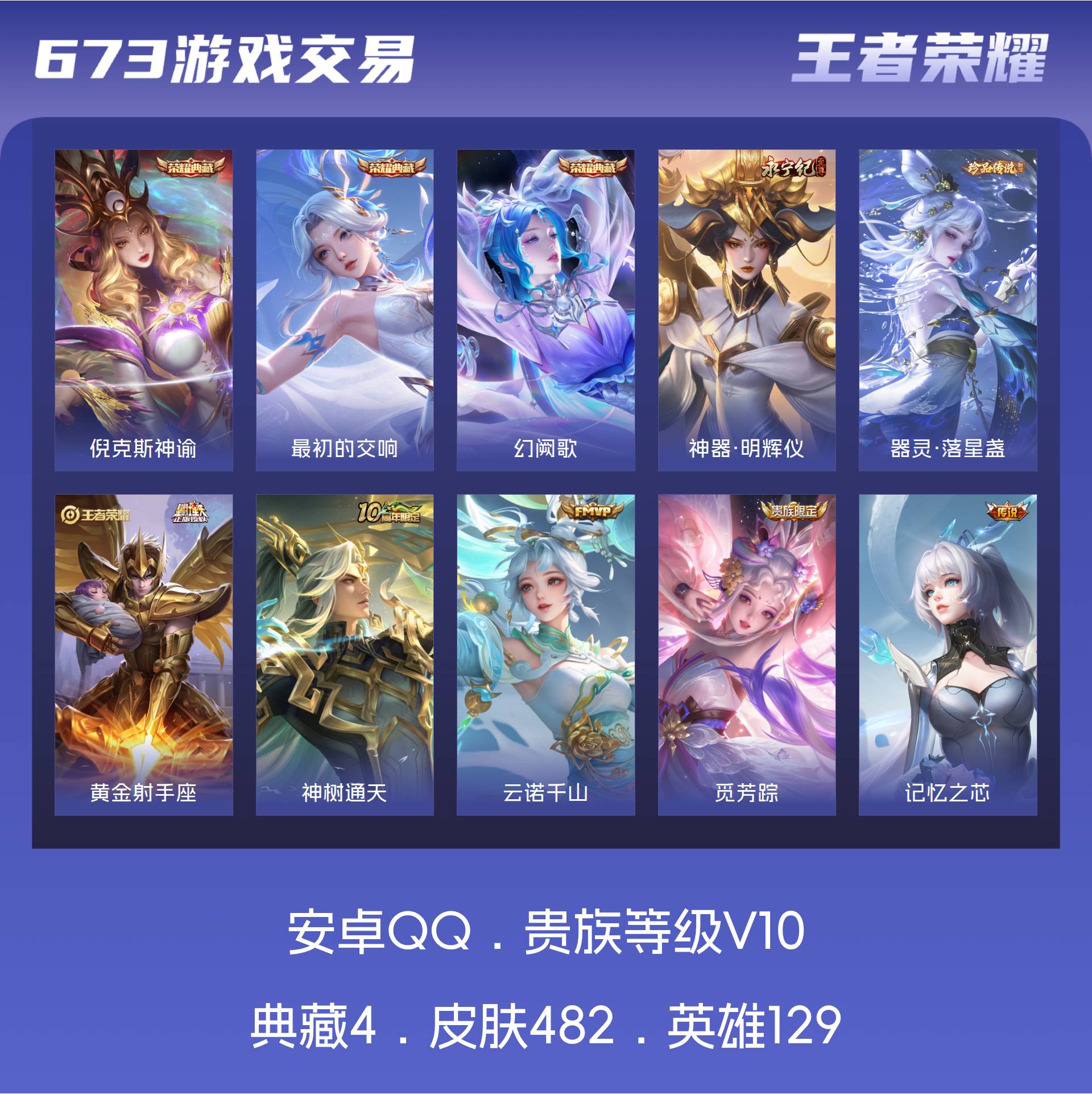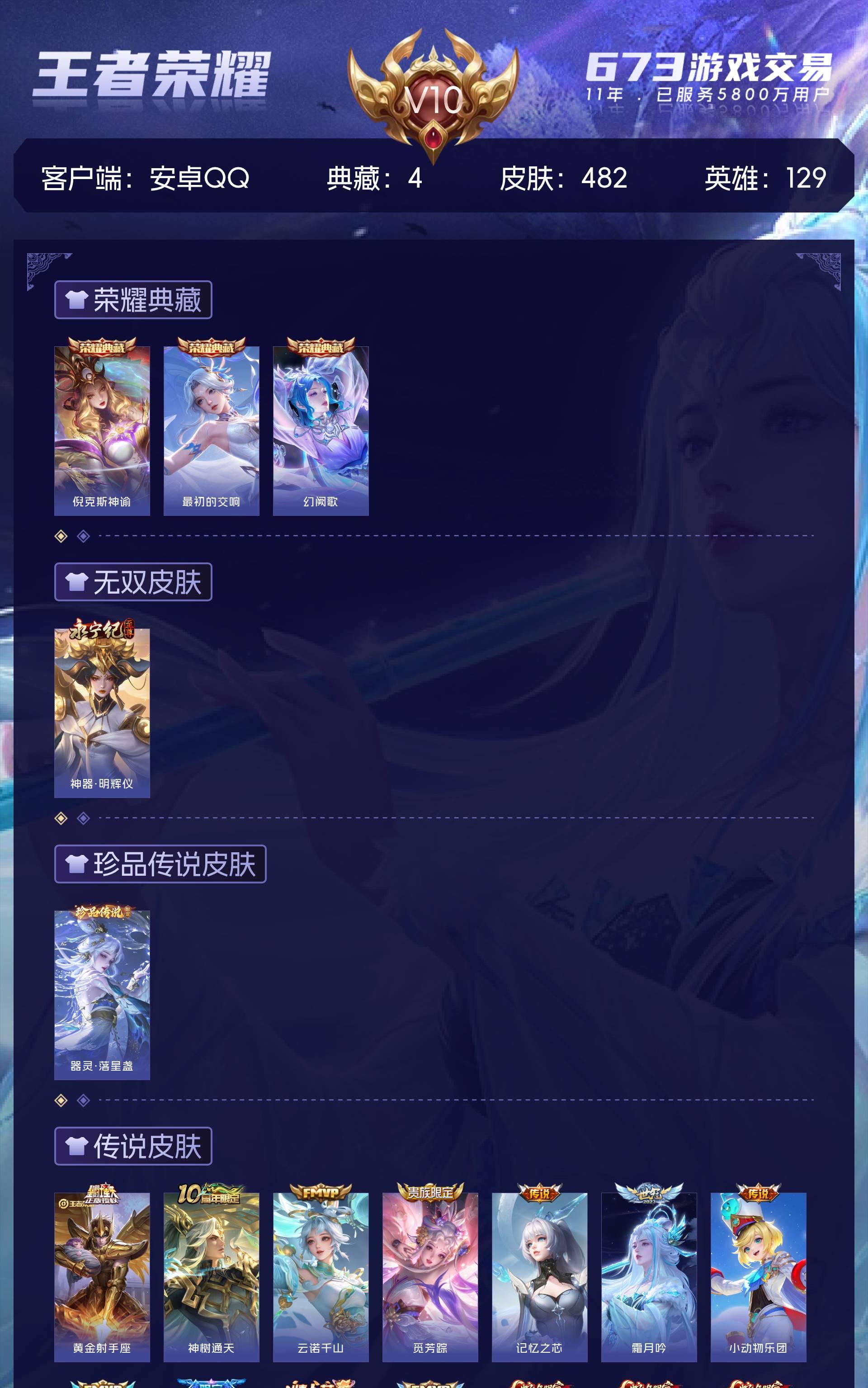 V10 皮肤482 英雄129 至圣王者 荣耀典藏4 无双皮肤1 珍品传说1 传说45 其他皮肤438