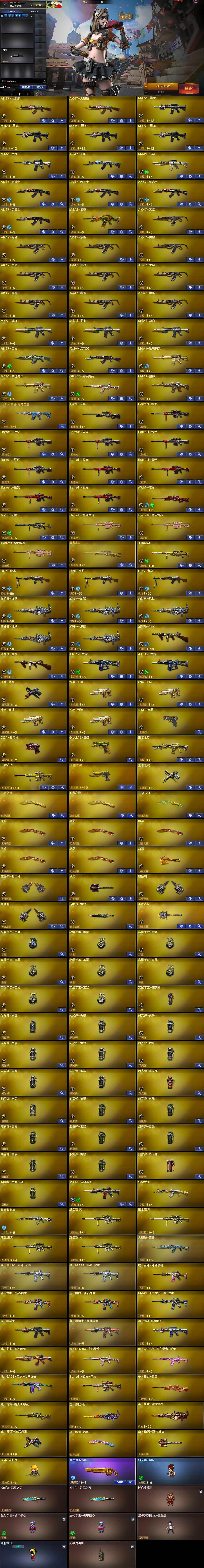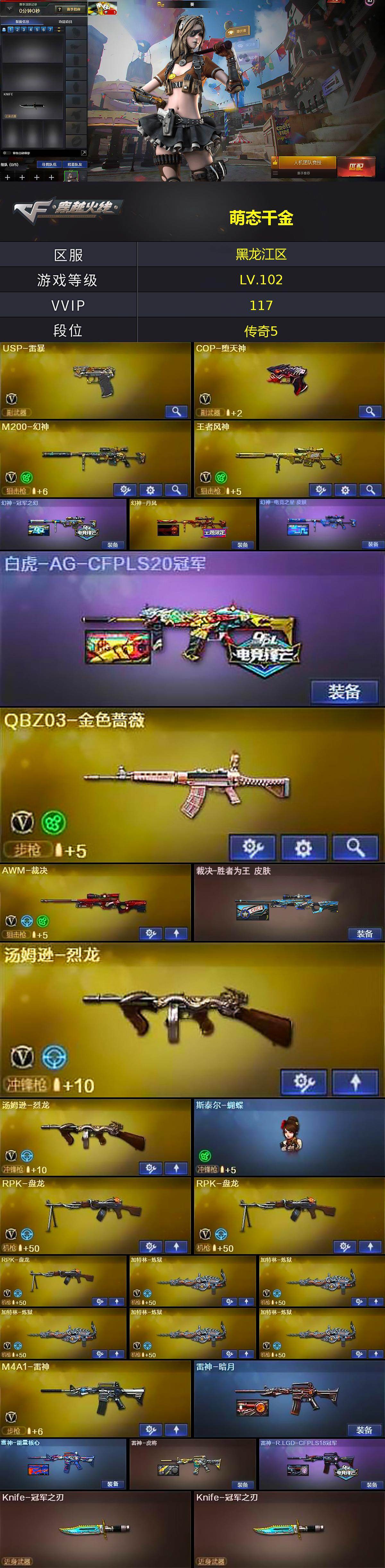 【热门武器】:QBZ03-金色蔷薇,M200-幻神,汤姆逊-烈龙*2,RPK-盘龙*3,加特林-炼狱*5,斯泰尔-蝴蝶,USP-雷暴,COP-堕天神,沙鹰-修罗,Knife-冠军之刃*2