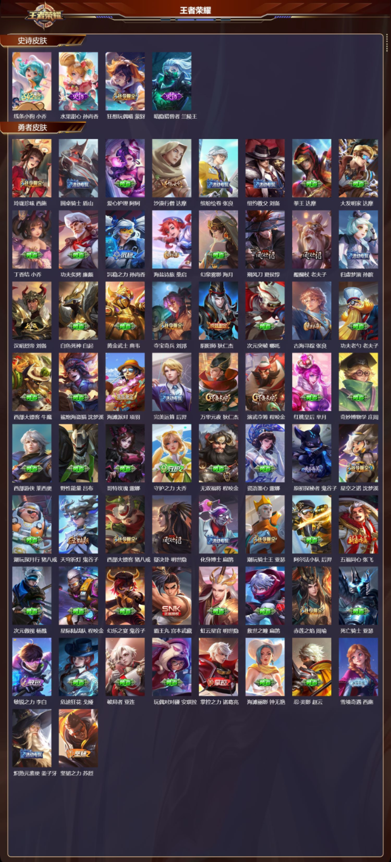 127英雄-238皮肤-安卓QQ 可二次/v9永恒钻石/皮肤号/白虎志 百里玄策,李逍遥 曜,零号·赤焰 孙悟空,地狱火 孙悟空,凤求凰 李白,时雨天司 诸葛亮,音你心动 周瑜,黄金射手座 后羿,末日机甲 孙尚香,一念神魔 李信,天魔缭乱 吕布,/238皮肤/127英雄/1典藏/0珍品无双/0无双/0珍品传说/14传说/59史诗/8稀有英雄