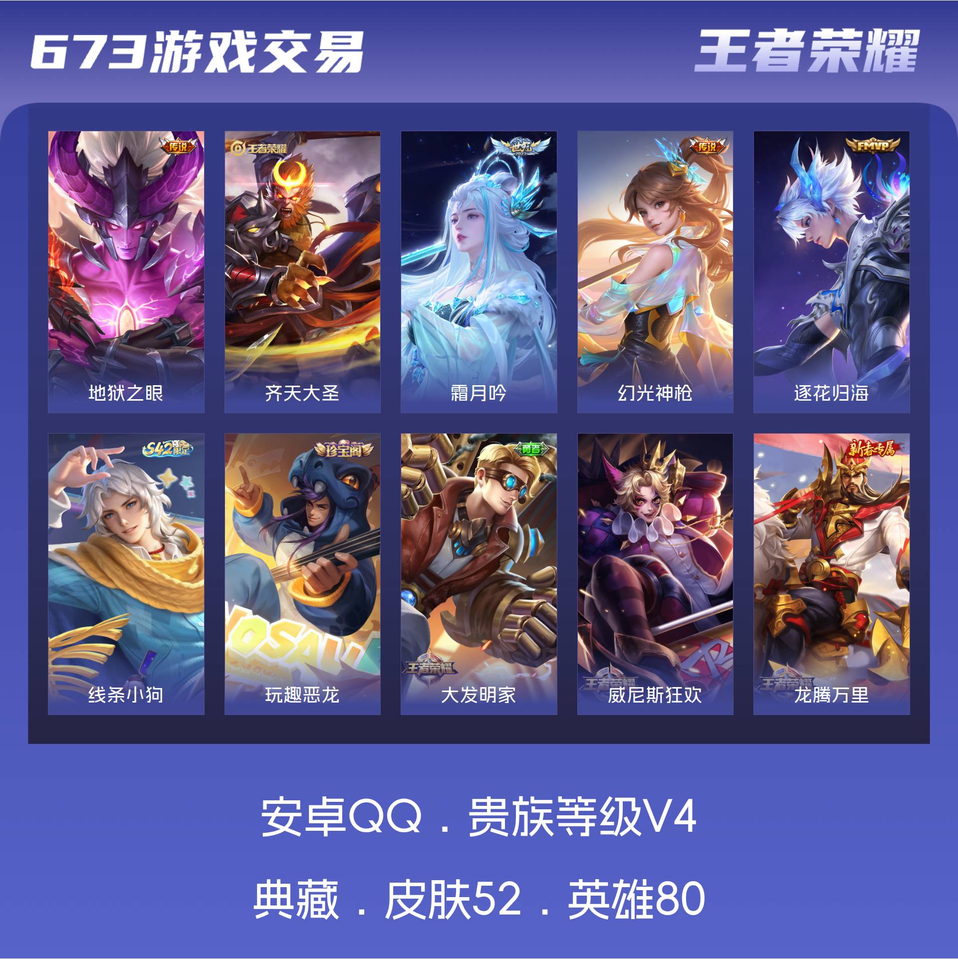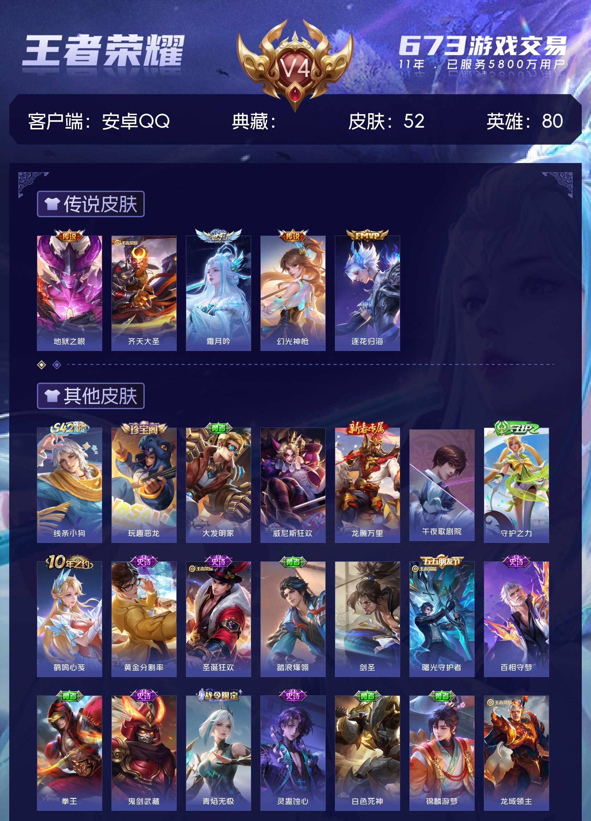 V4 皮肤52 英雄80 永恒钻石 传说5 其他皮肤54