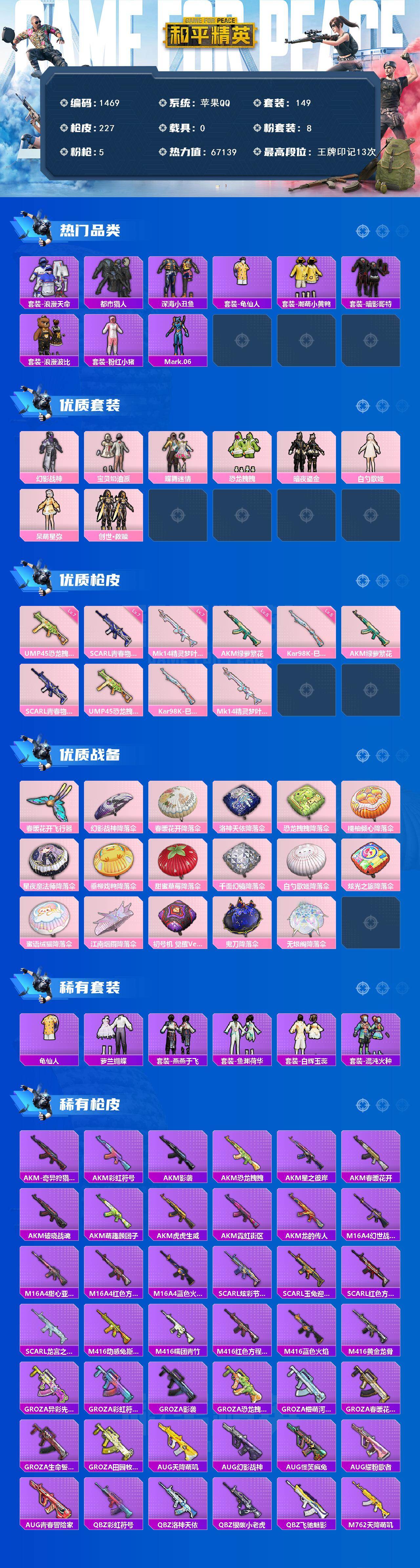 苹果 手Q-【极品身法,素材,小雾神同款,哥特红眼罩,都市猎人,深海小丑鱼,狂沙,金羽头盔全套 恐龙猫包全套,蓝螳螂,】8粉装-5特效枪-0载具-1粉色飞行器-67139热力值-13王牌印记-149套装-227枪皮