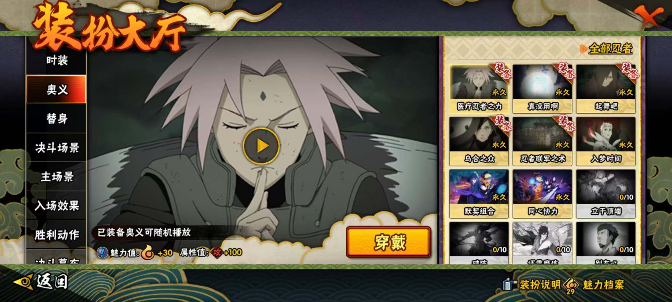 【S级忍者】:宇智波斑「秽土转生·解」(3星),宇智波鼬「须佐能乎」(3星),千手柱间「木叶创立」(3星),自来也「舞之豪杰」(3星),波风水门(3星),漩涡鸣人「九喇嘛连结」(3星),佩恩「天道」(3星),波风水门「九喇嘛连结」(3星),漩涡鸣人·宇智波佐助(3星)