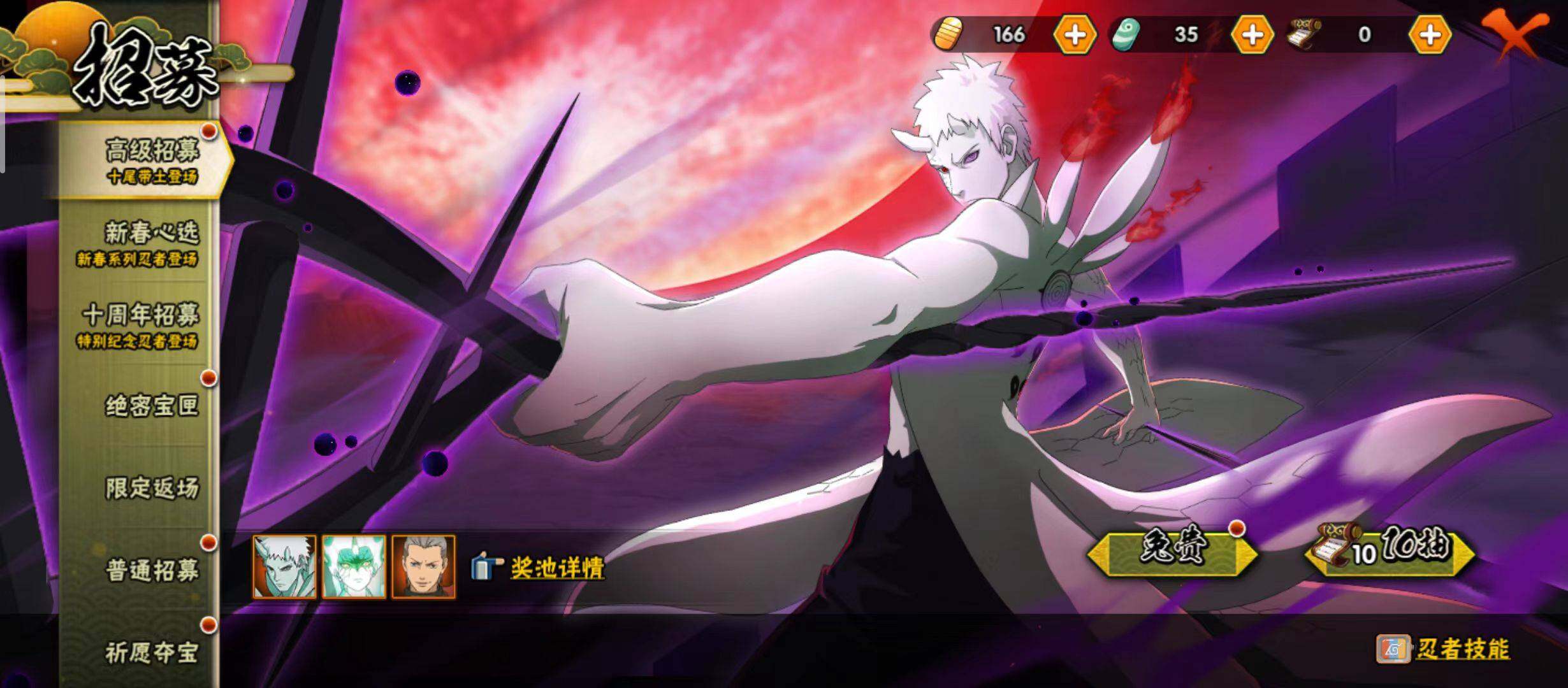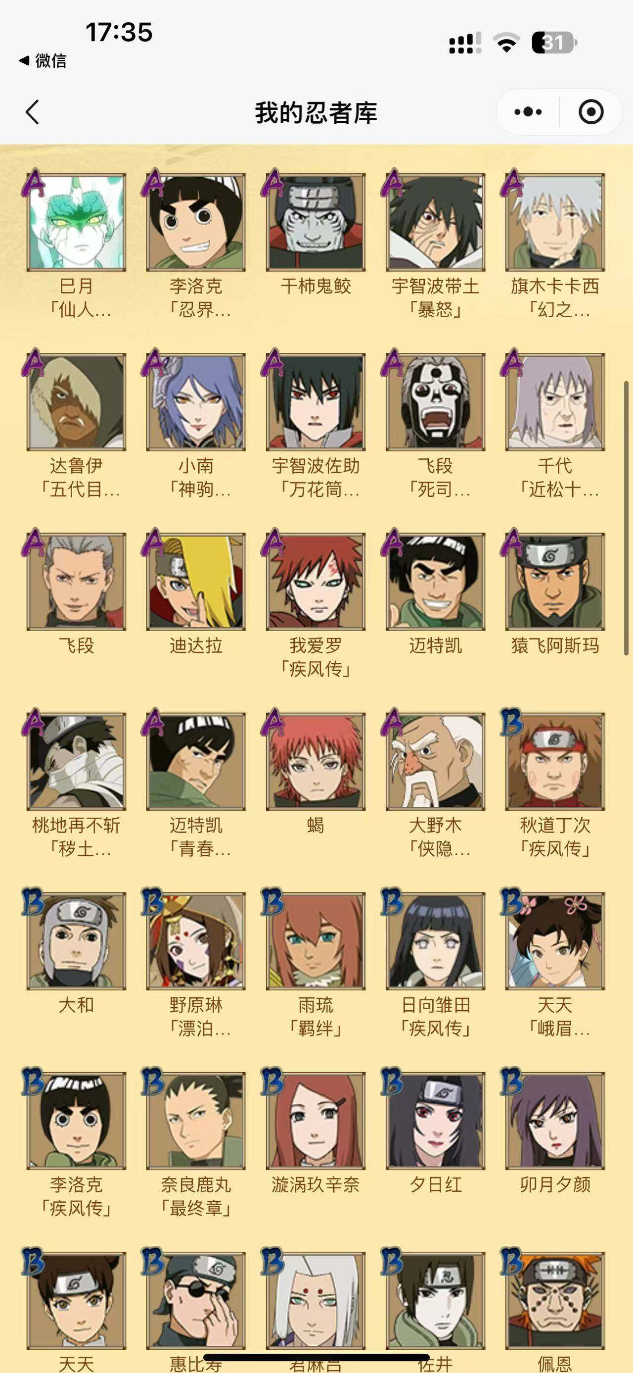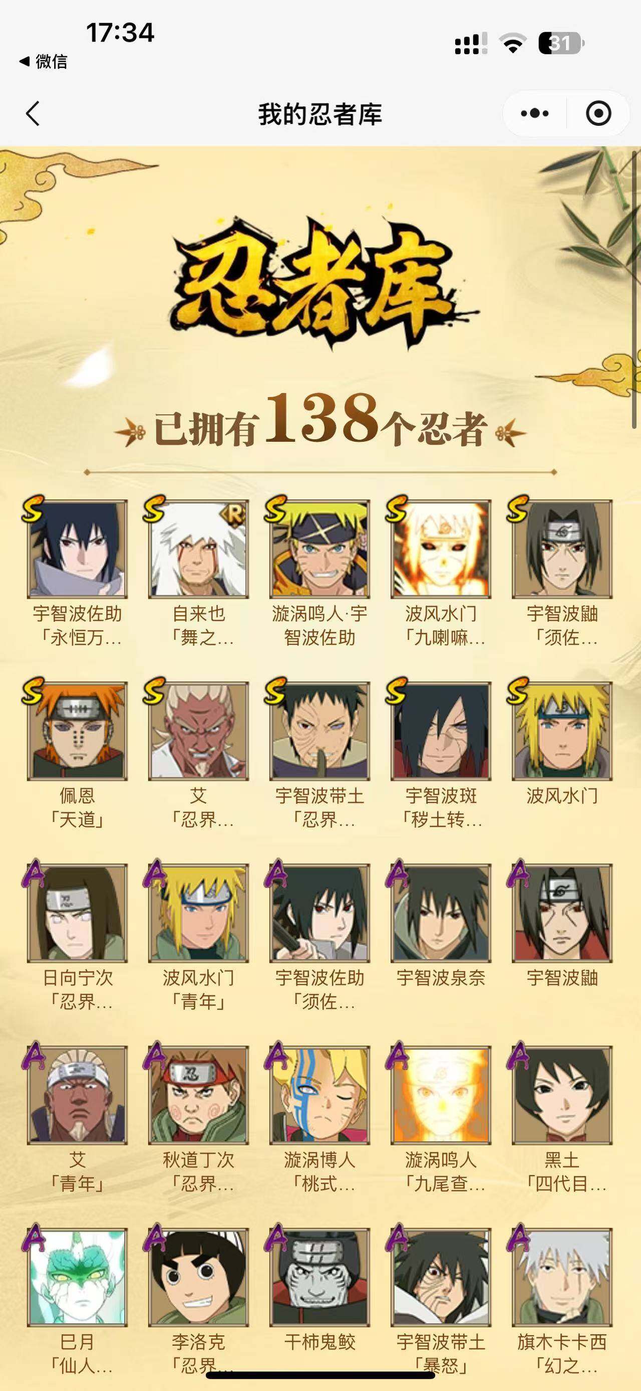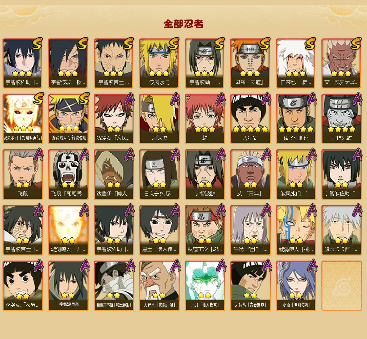 【S级忍者】:宇智波斑「秽土转生·解」(3星),宇智波带土「忍界大战」(3星),艾「忍界大战」(3星),宇智波鼬「须佐能乎」(3星),自来也「舞之豪杰」(3星),波风水门(3星),佩恩「天道」(3星),宇智波佐助「永恒万花筒」(3星),波风水门「九喇嘛连结」(3星),漩涡鸣人·宇智波佐助(3星)
