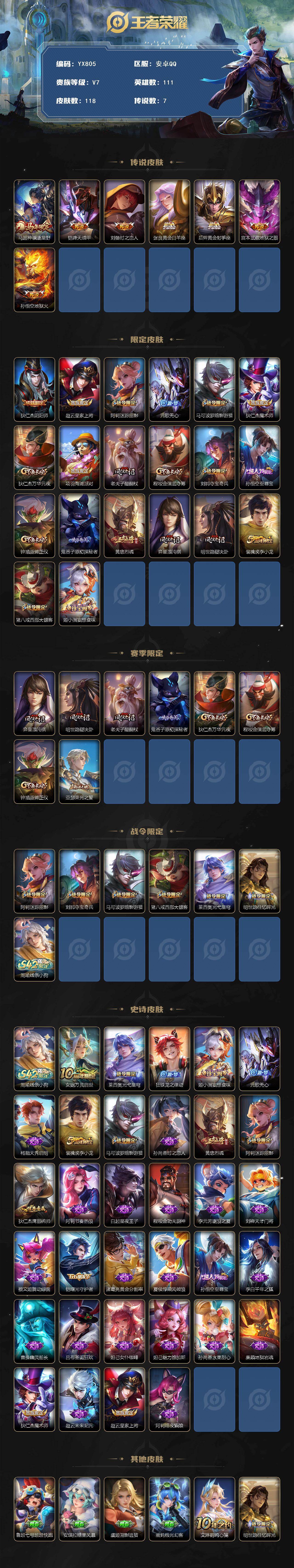【限定皮肤】:狄仁杰阴阳师,赵云皇家上将,阿轲迷踪丽影,元歌无心,马可波罗暗影游猎,狄仁杰魔术师,狄仁杰万华元夜,项羽海滩派对,老夫子醍醐杖,程咬金演武夺筹,刘邦夺宝奇兵,钟馗驱傩正仪,鬼谷子原初探秘者,黄忠烈魂,弈星混沌棋,明世隐疑决卦,裴擒虎李小龙,猪八戒西部