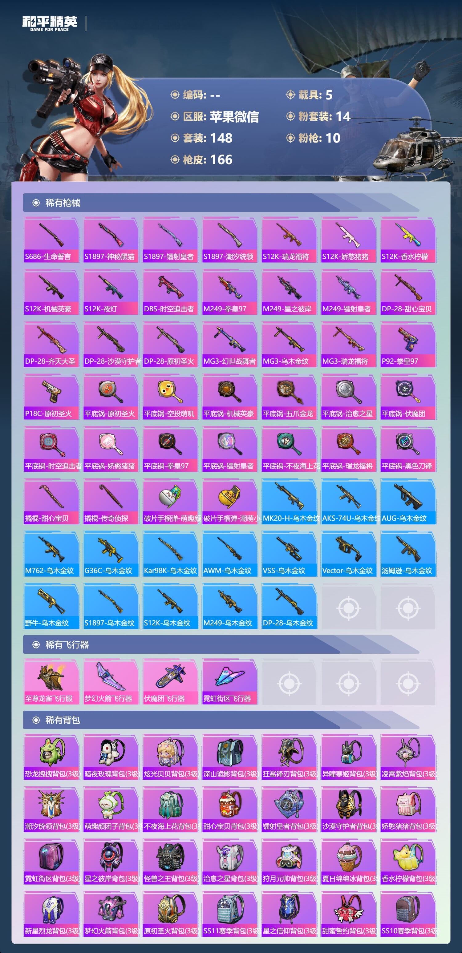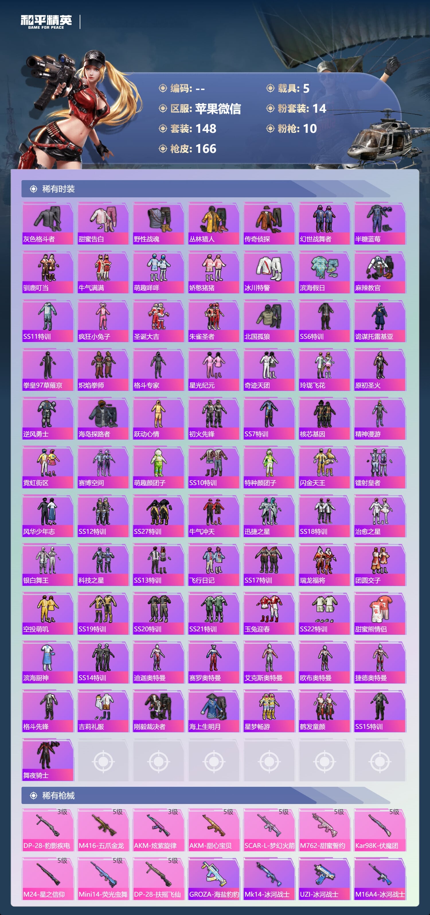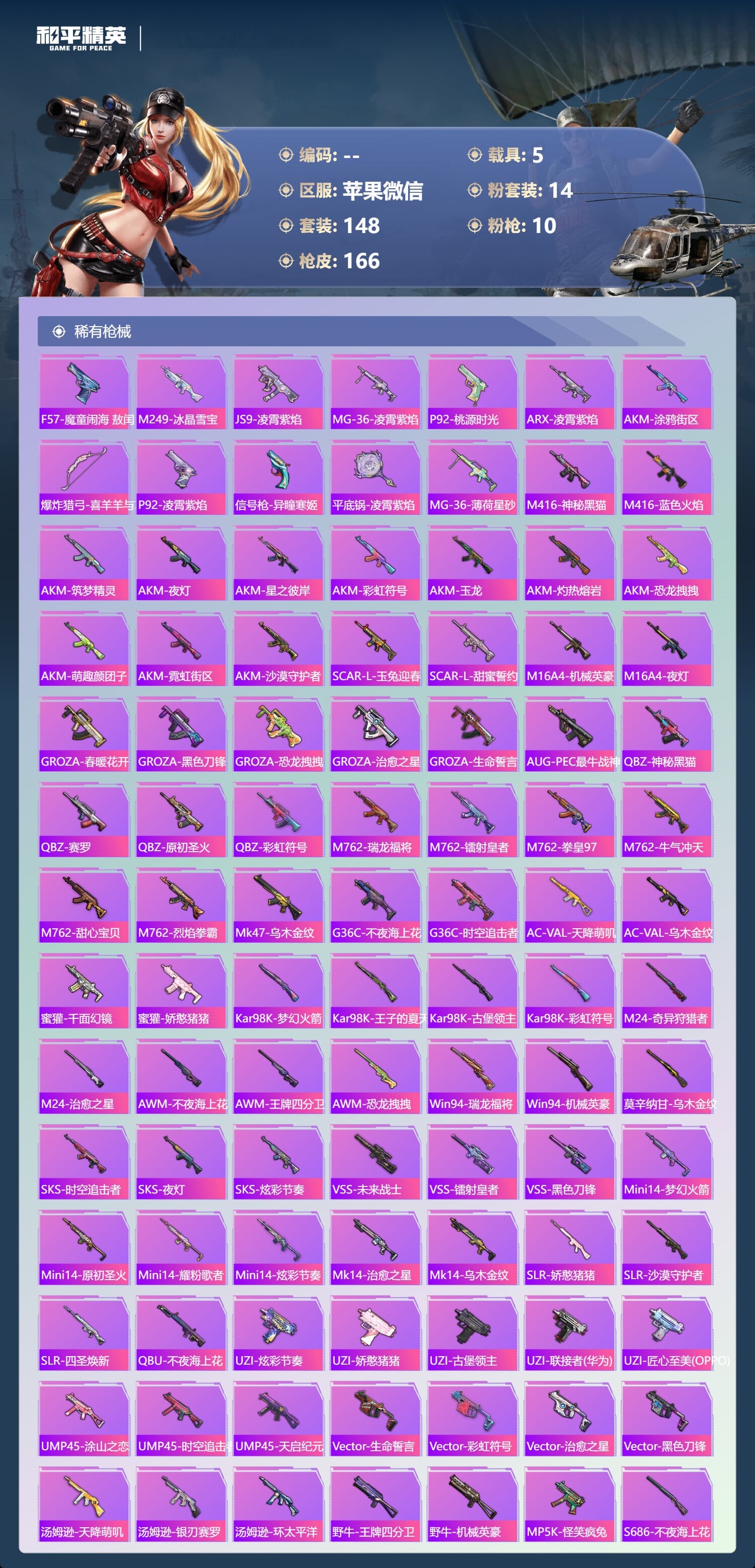 a4293/苹果微/11王牌印记-14粉装-10特效枪-5载具-74304热力值-148套装-16