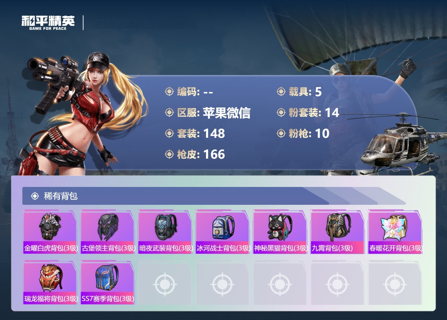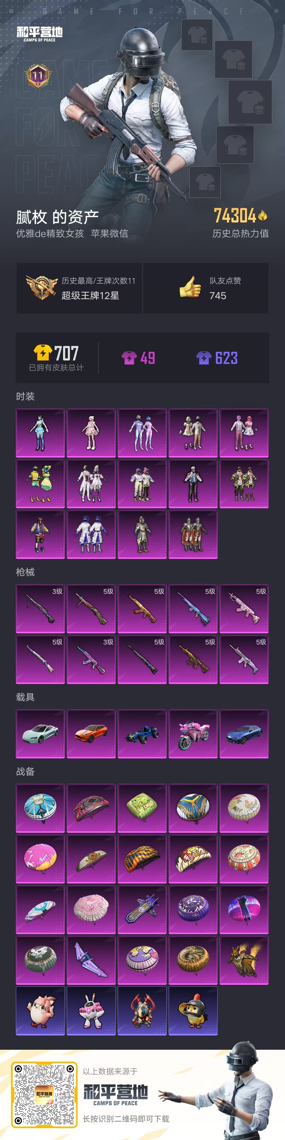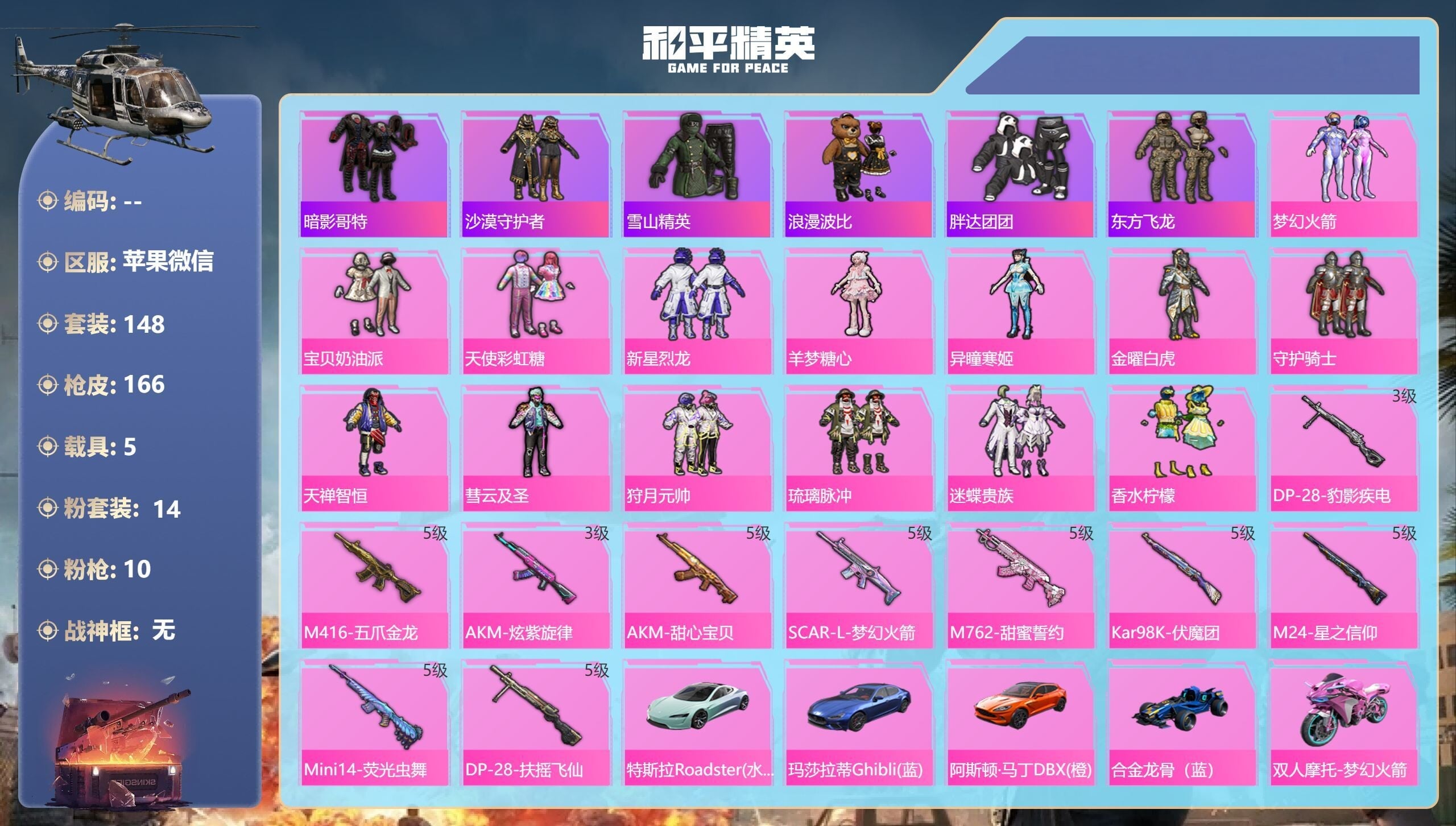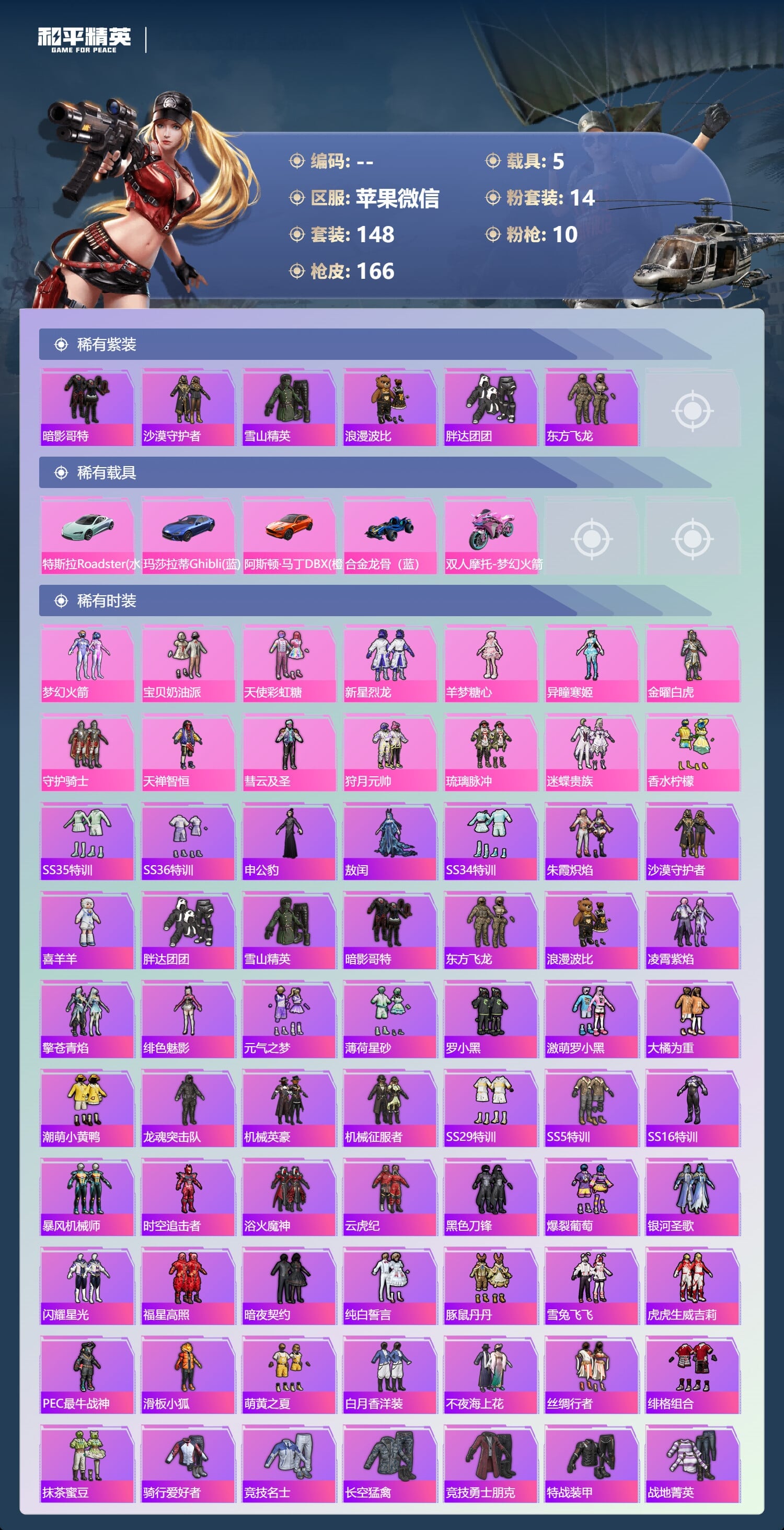 a4293/苹果微/11王牌印记-14粉装-10特效枪-5载具-74304热力值-148套装-16