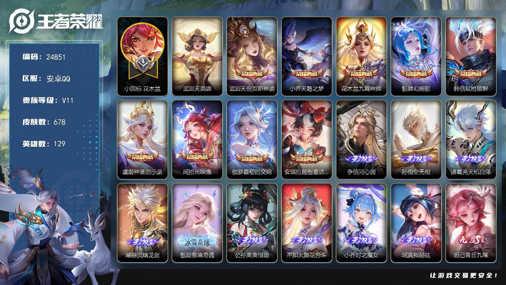可换绑【极品无双V10女号·妲己全皮·小乔全皮·大乔全皮·蔡文姬全皮·公孙离全皮·瑶全皮·西施全皮·马年全套·游走47段·中路42段·小乔女娲大乔瑶武则天金标·9典藏含武则天英雄·12无双·8珍品·朵莉亚心动手记·永恒水手月亮·紫瑶·2小兵·Kuromi时间天幕·Hello Kitty天幕·花朝如约天幕·浪翻一夏天幕·春韵弦音天幕】3903星币,238戳戳,7星传
