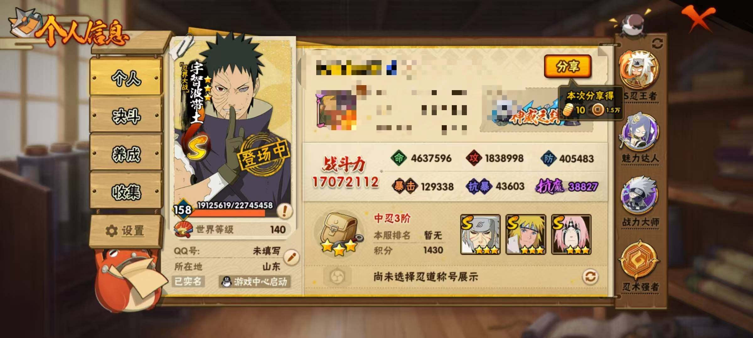 【HYZ3035】V10/战力1700W/S忍37/A忍49/秽土转生-宇智波斑/百豪-纲手/2星大野木「侠隐江湖」/五代目雷影-达鲁伊/死司凭血-飞段/二代目土影-无/宇智波止水/5星猿飞阿斯玛/须佐能乎-旗木卡卡西/2星小南「神驹佑将」/宇智波斑/秽土转生-猿飞日斩/五代目水影-照美冥/千手扉间/秽土转生-猿飞阿斯玛/5星迈特凯/自来也/忍界大战-奇拉比/秽土转生-千手扉间/木叶创立-千手柱间/仙人模式-药师兜/六代目水影-长十郎/2星蝎「绯流琥」/2星桃地再不斩「秽土转生」/百豪-春野樱/