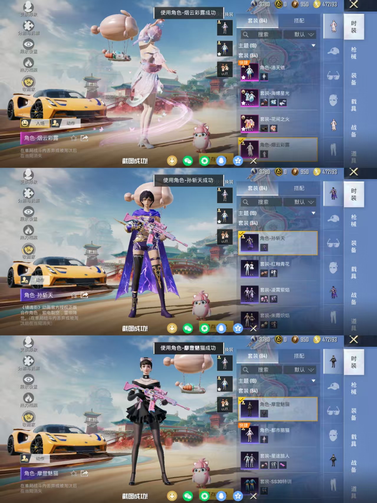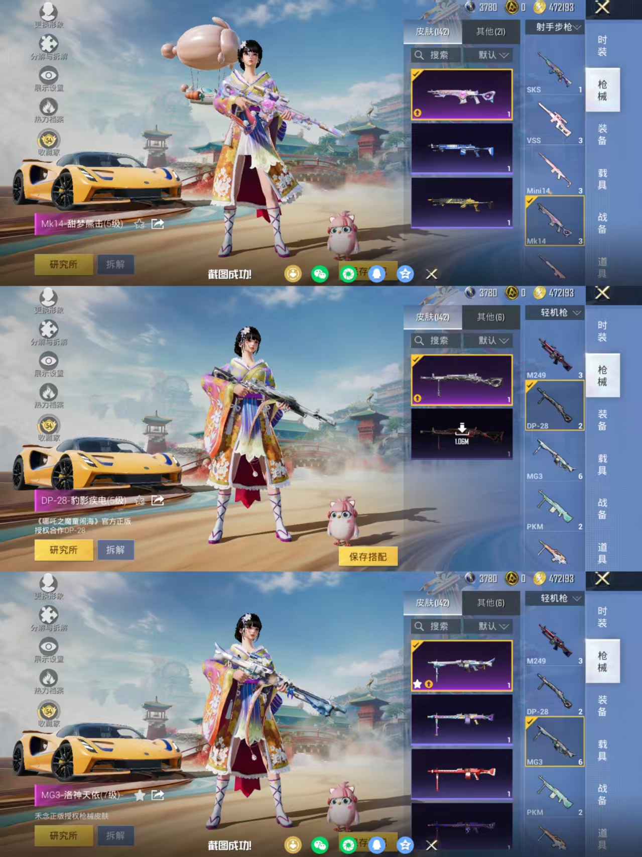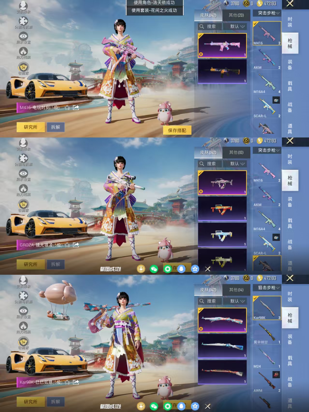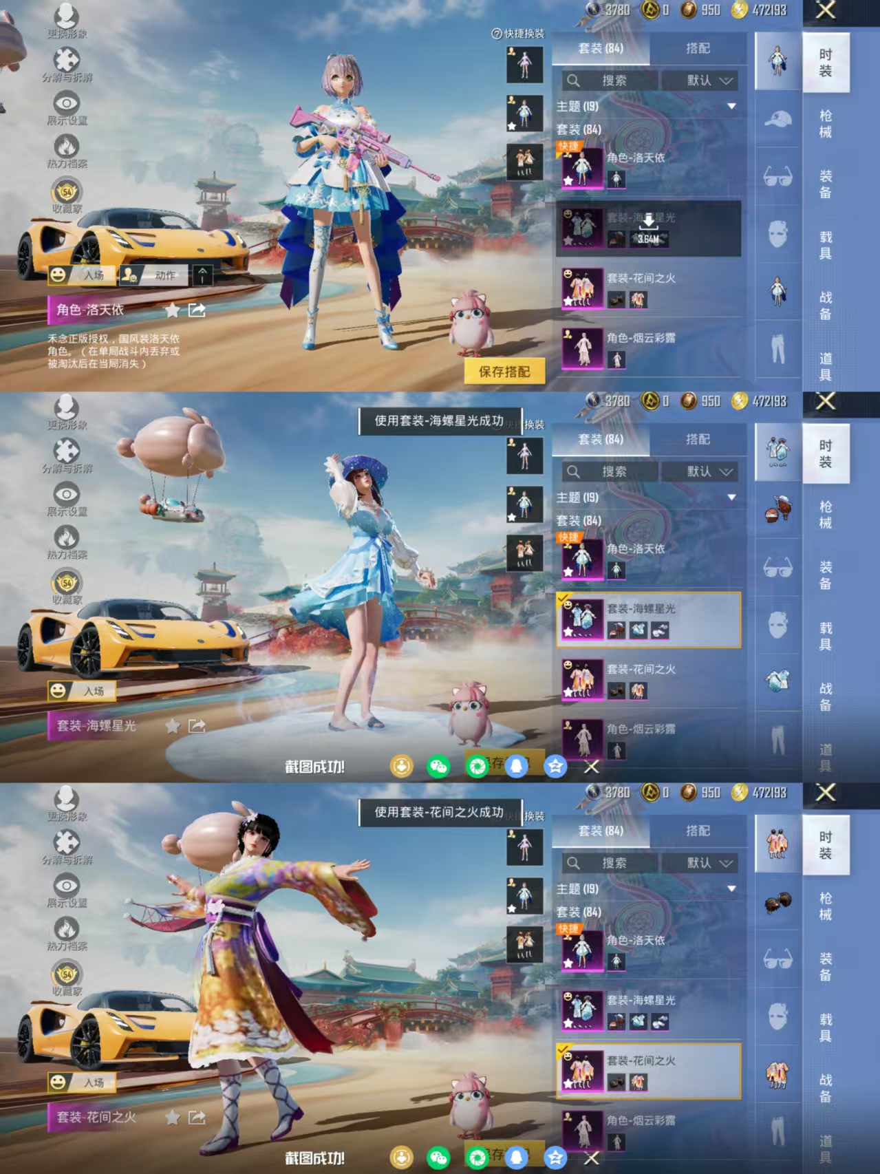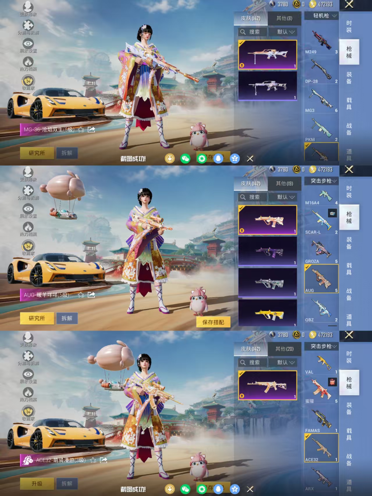 【女号3载具-4粉装-10特效枪 洛天依 花间之火 烟云彩露 AUG-暖羊咩咩满级 MG3-洛神天依满级 地铁满天赋】安卓手Q-3载具-4粉装-10特效枪-84套装-142枪皮-3王牌印记-不朽星钻Ⅰ-43840热力值【3载具】路特斯EVIJA(星际黄),焰龙咆哮 萌兔起飞【4粉装】角色-烟云彩露,角色-洛天依,花间之火,海螺星光【10特效枪】GROZA-镜光银凌[5级],Mk14-甜梦熊击[5级