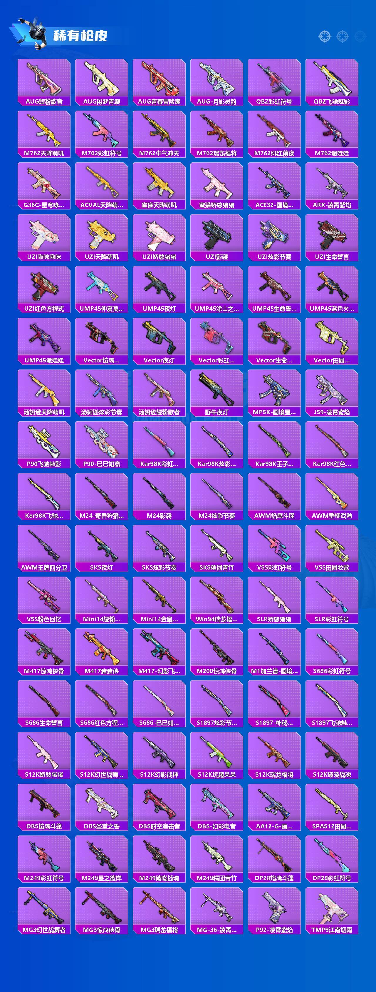 【粉色枪皮等级】:SCAR-L-锦绣绵绵(五级),M416-风花雪月(七级),M416-电玩时刻(五级),UMP45-萌骑冒险(四级),AKS-74U-森灵之息(四级),Kar98K-