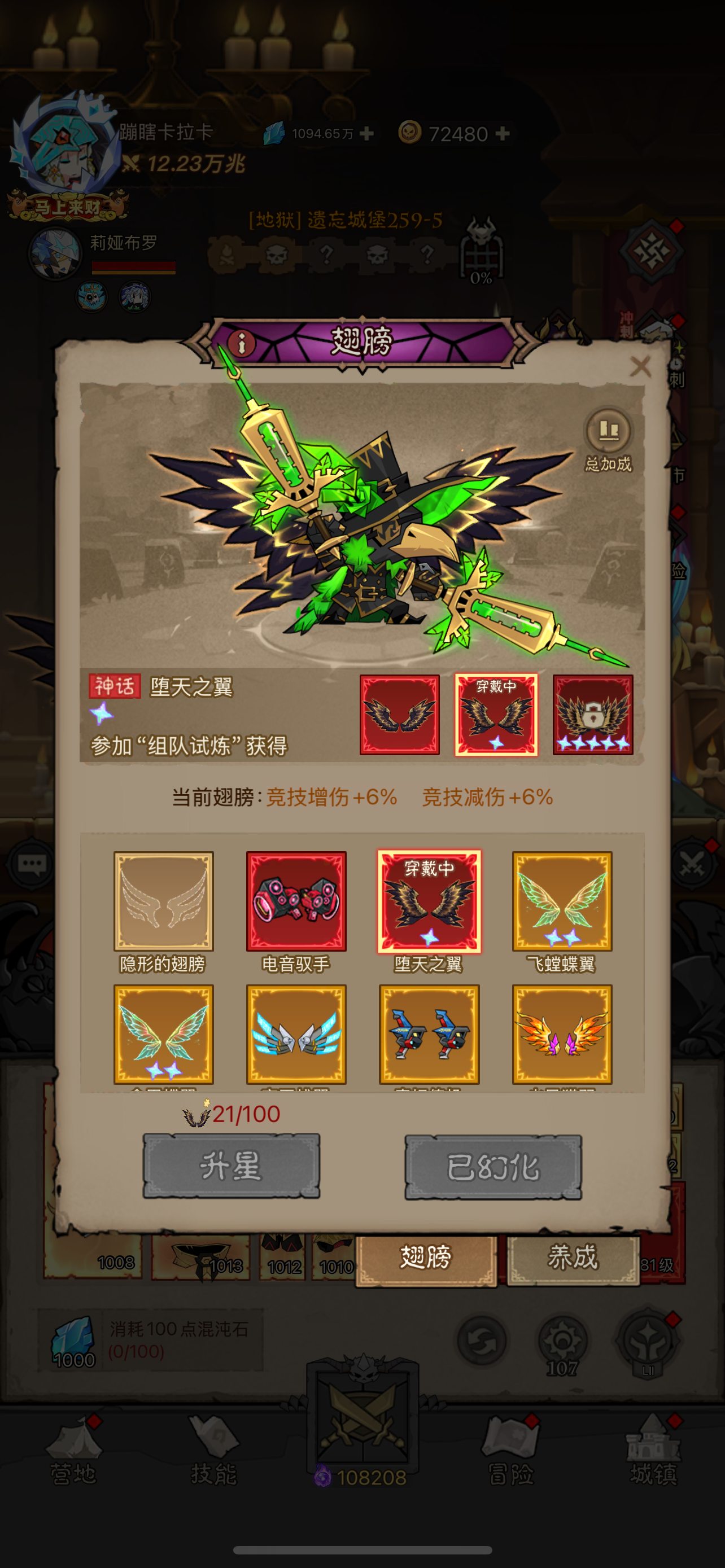 本区战力榜一,竞技场无敌,侍从皮肤三个都有,包里还有十个紫水晶,资源多,双永恒暗能,皮肤翅膀多,双十二刻印很多,最高战力可达13万兆