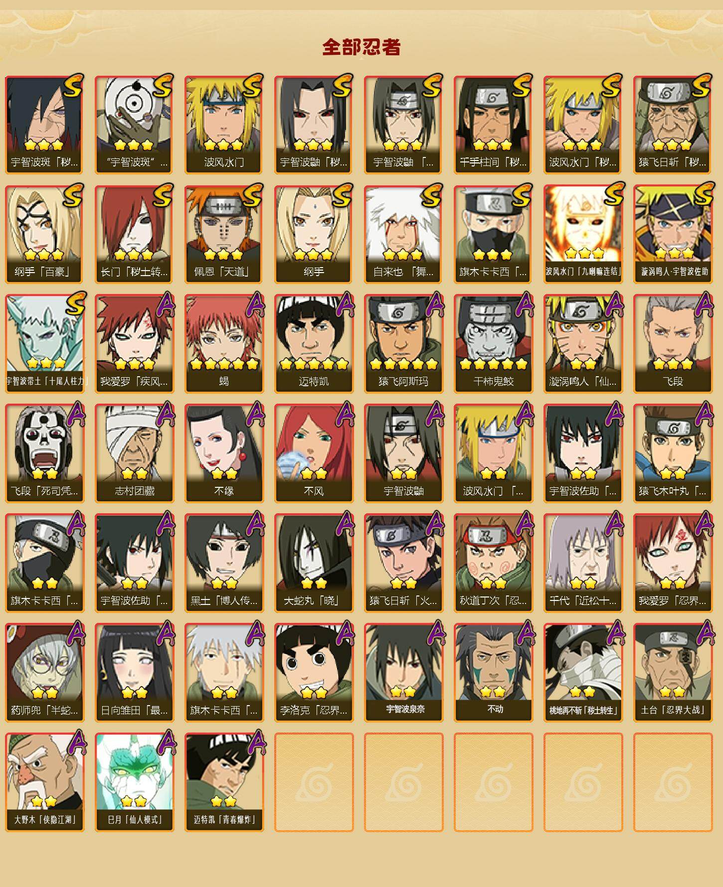 【HYYH1227】V6/战力1307W/S忍17/A忍34/百豪-纲手/2星大野木「侠隐江湖」/忍界大战-旗木卡卡西/纲手/3星波风水门「九喇嘛连结」/3星宇智波带土「十尾人柱力」/死司凭血-飞段/5星猿飞阿斯玛/须佐能乎-旗木卡卡西/火影继承人-猿飞日斩/5星蝎/秽土转生-猿飞日斩/5星迈特凯/2星桃地再不斩「秽土转生」/白面具-宇智波斑/四代目土影-黑土/半蛇斗篷-药师兜/万花筒写轮眼-宇智波佐助/志村团藏/忍界大战-我爱罗/2星不动/不缘/猿飞木叶丸/晓-大蛇丸/宇智波鼬/秽土转生-宇智