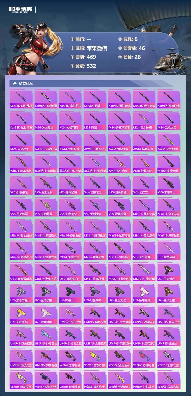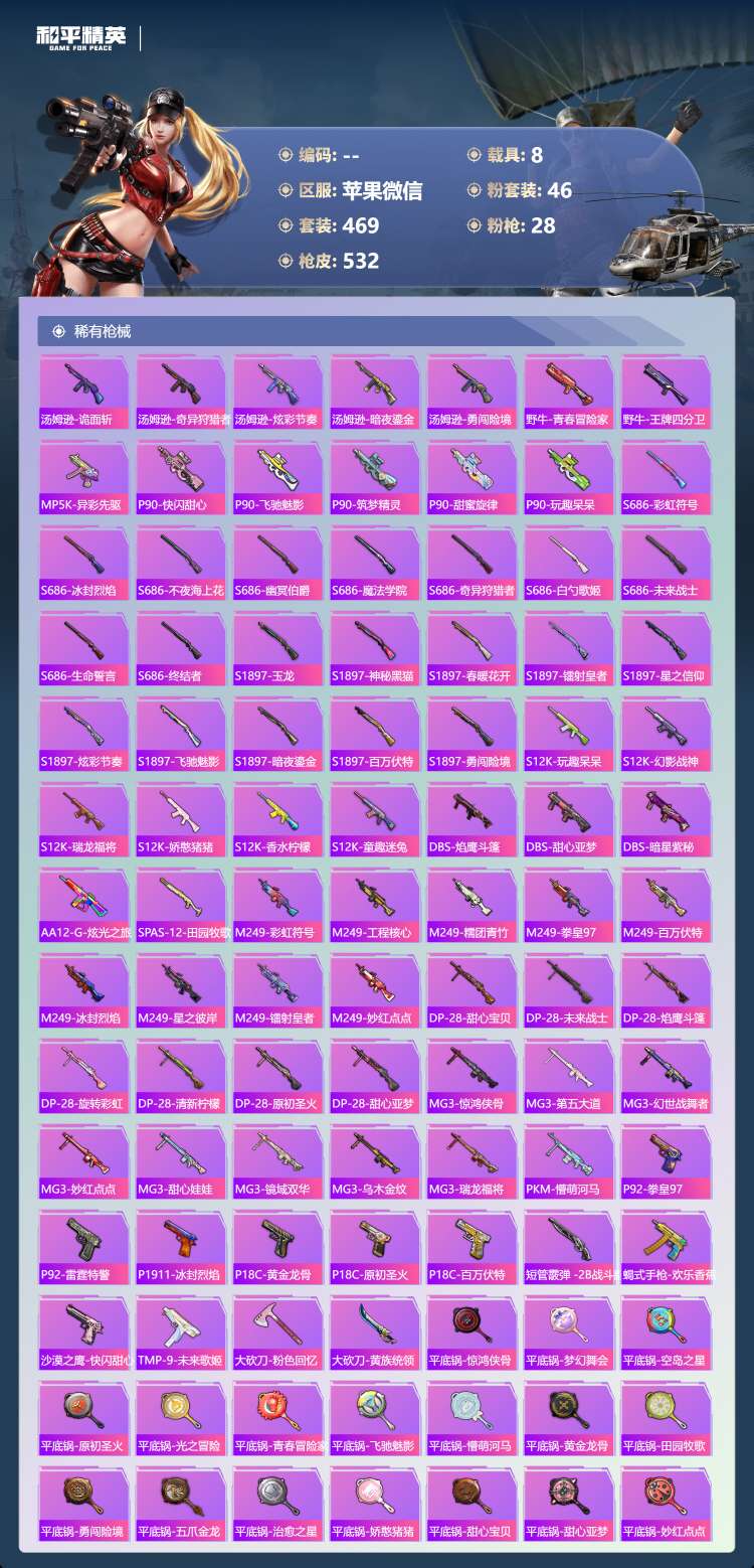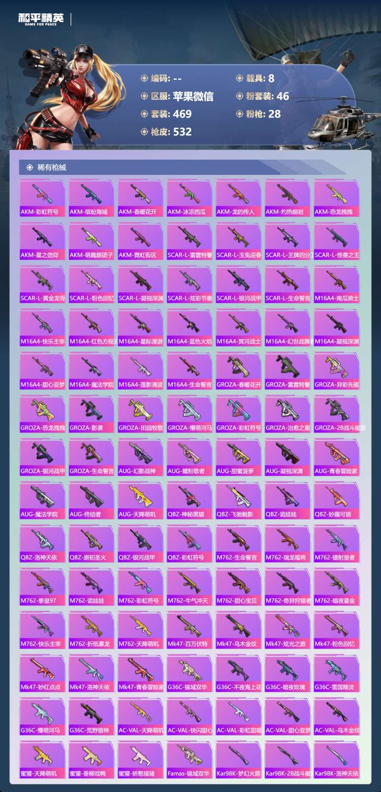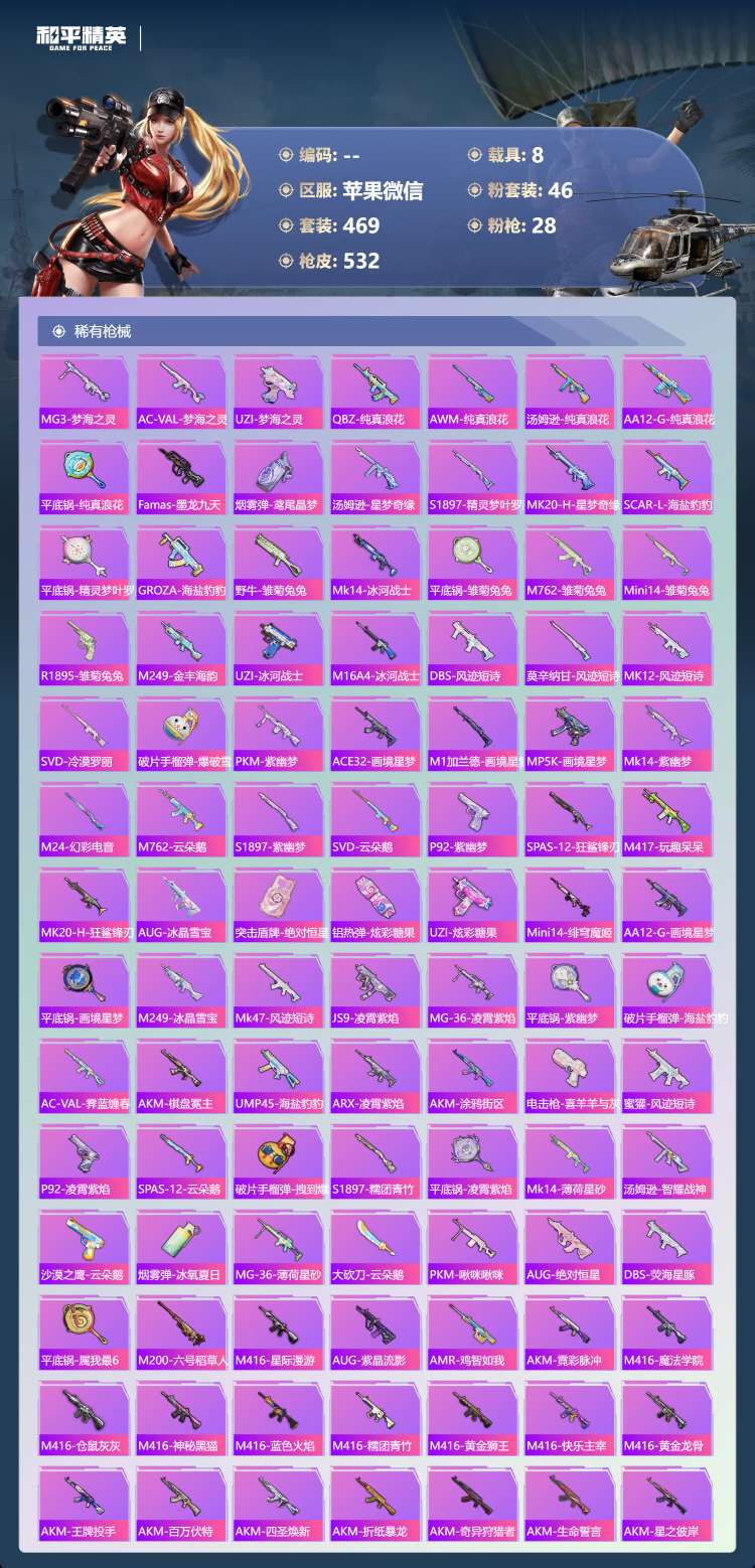 hs63305 苹果微-32王牌印记-有战神框-1红装-46粉装-28特效枪-8载具-249190