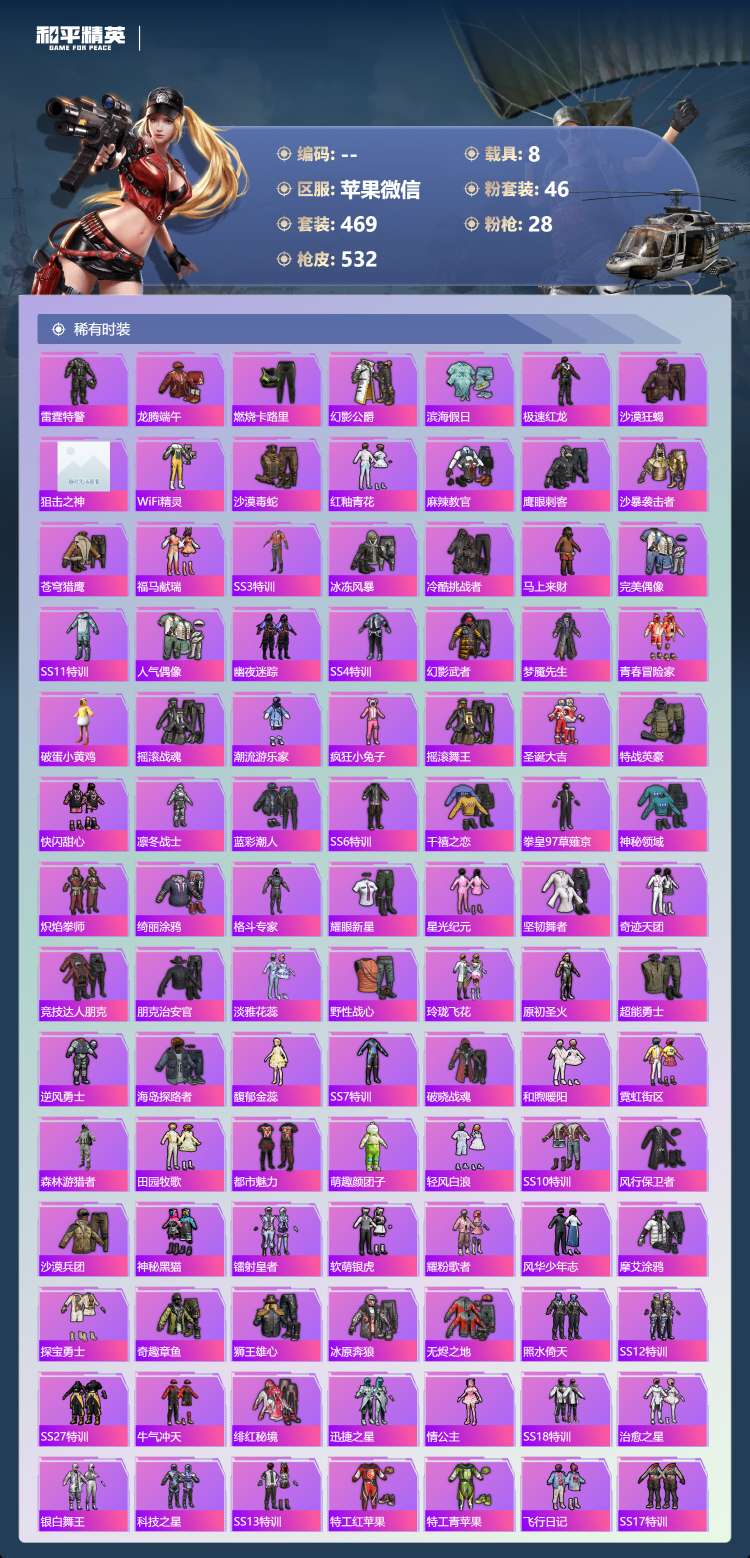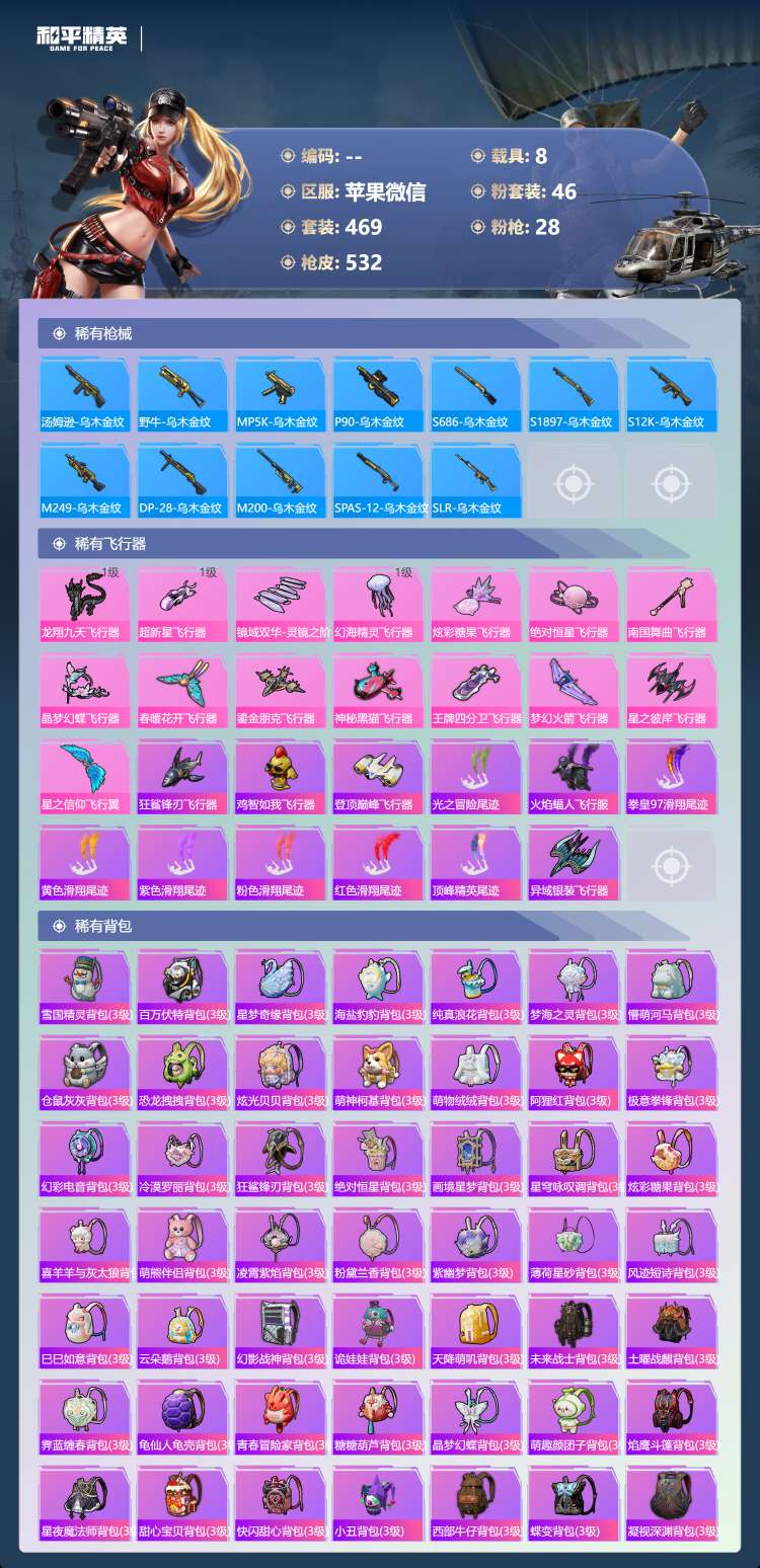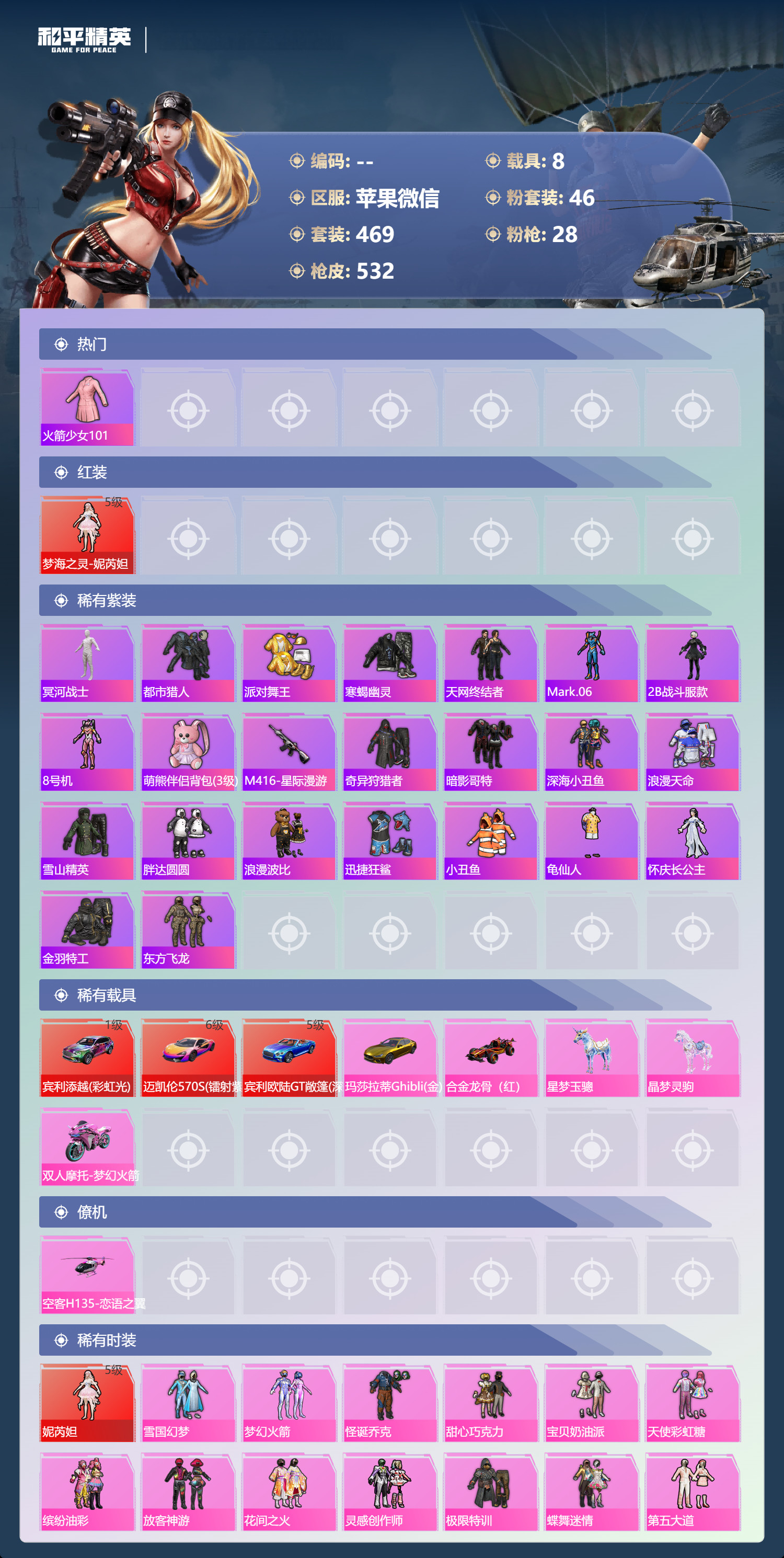 hs63305 苹果微-32王牌印记-有战神框-1红装-46粉装-28特效枪-8载具-249190
