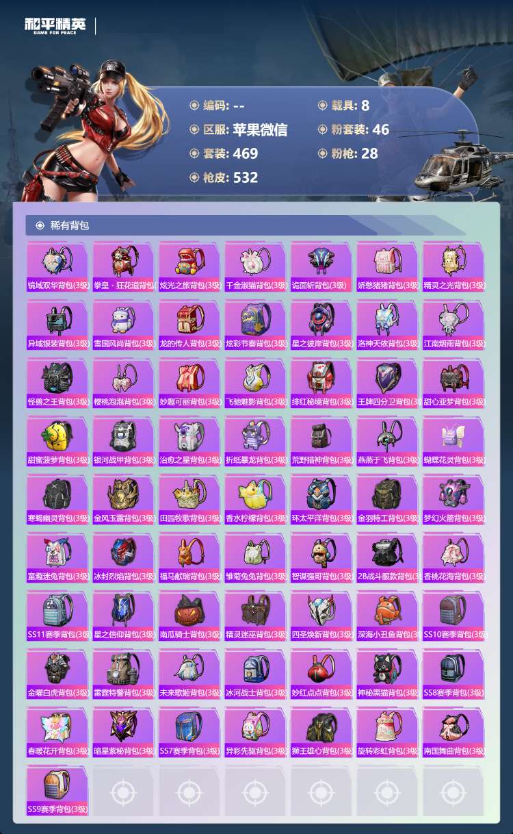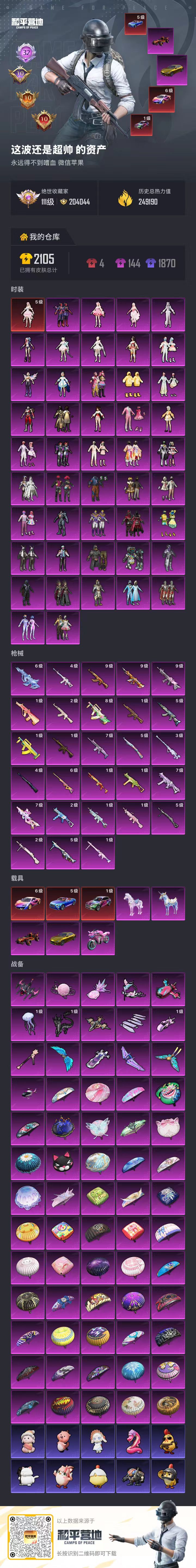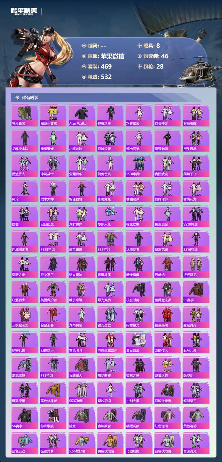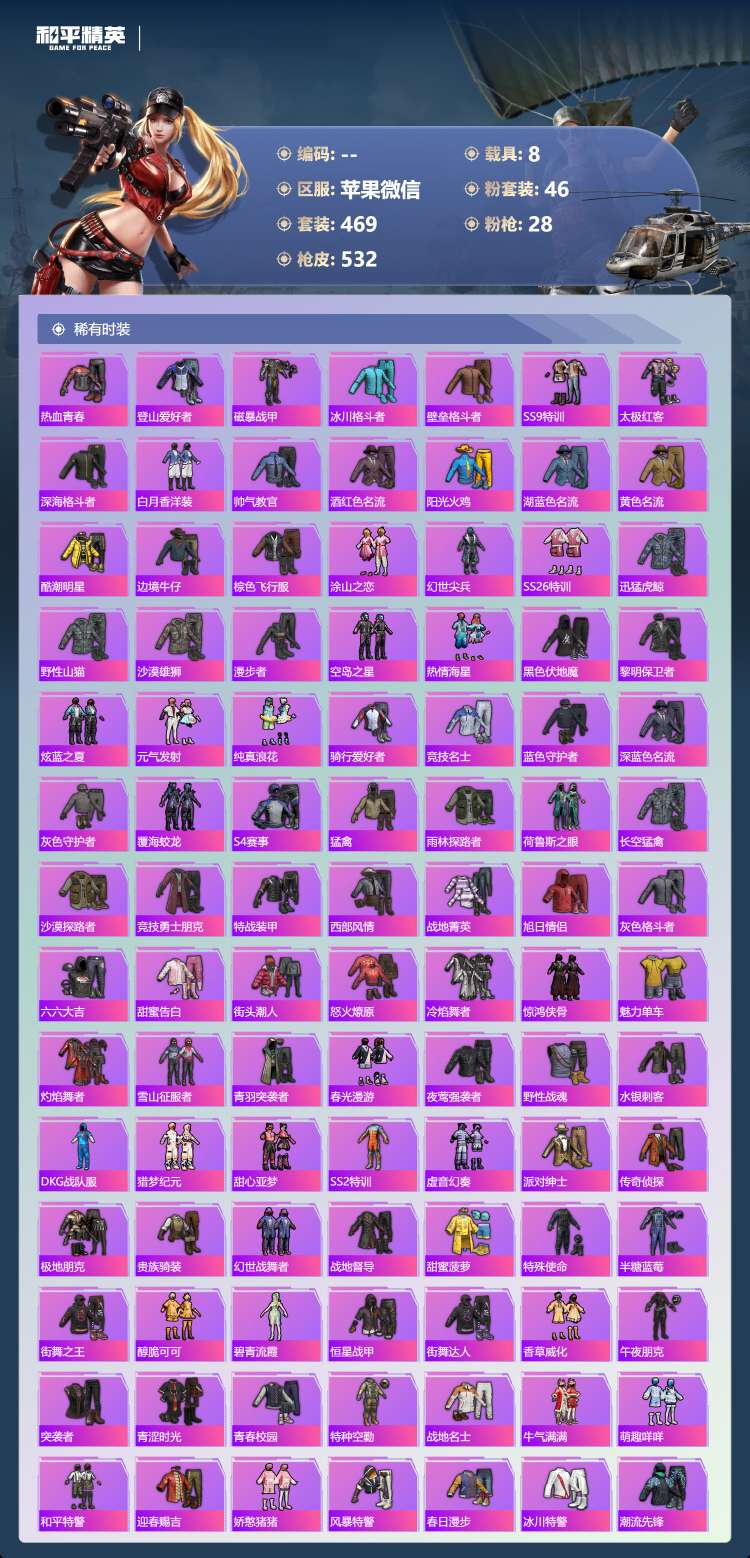 hs63305 苹果微-32王牌印记-有战神框-1红装-46粉装-28特效枪-8载具-249190