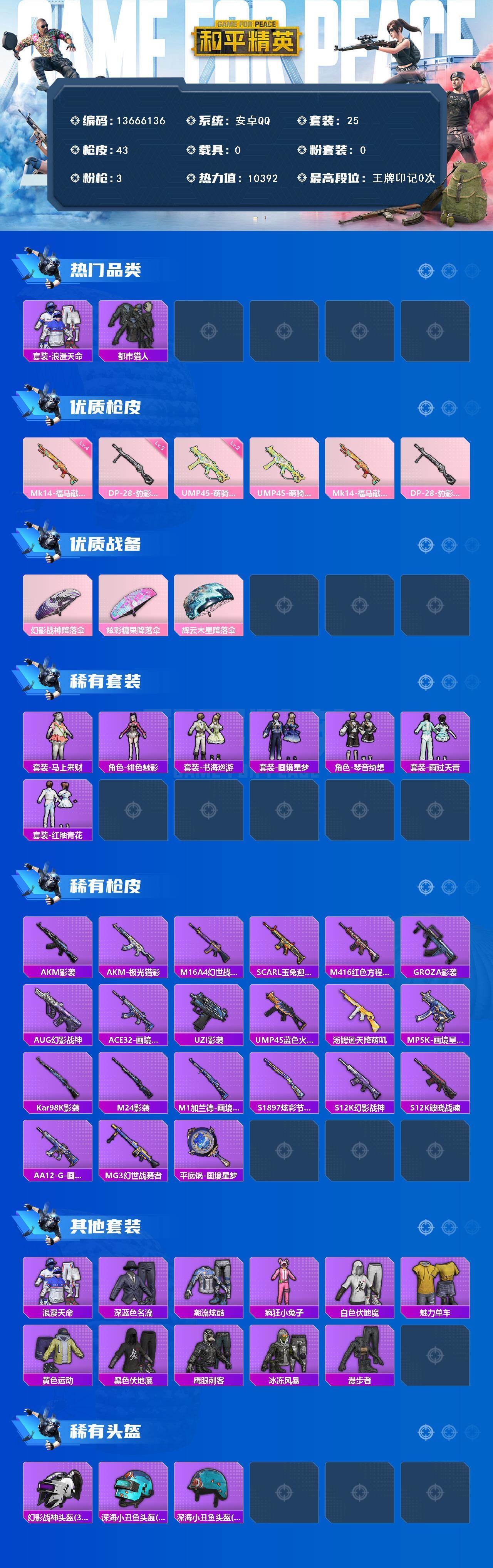 25套装/枪械3/装备39/战备37/热力值10392/二级UMP45-萌骑冒险/四级Mk14-福马献瑞/三级DP-28-豹影疾电/套装-浪漫天命/都市猎人/UMP45-萌骑冒险/Mk14-福马献瑞/DP-28-豹影疾电/幻影战神降落伞/炫彩糖果降落伞/辉云木星降落伞/套装-马上来财/角色-绯色魅影/套装-书海巡游/套装-画境星梦/套装-琴音绮想/套装-雨过天青/套装-红釉青花/AKM-影袭/A