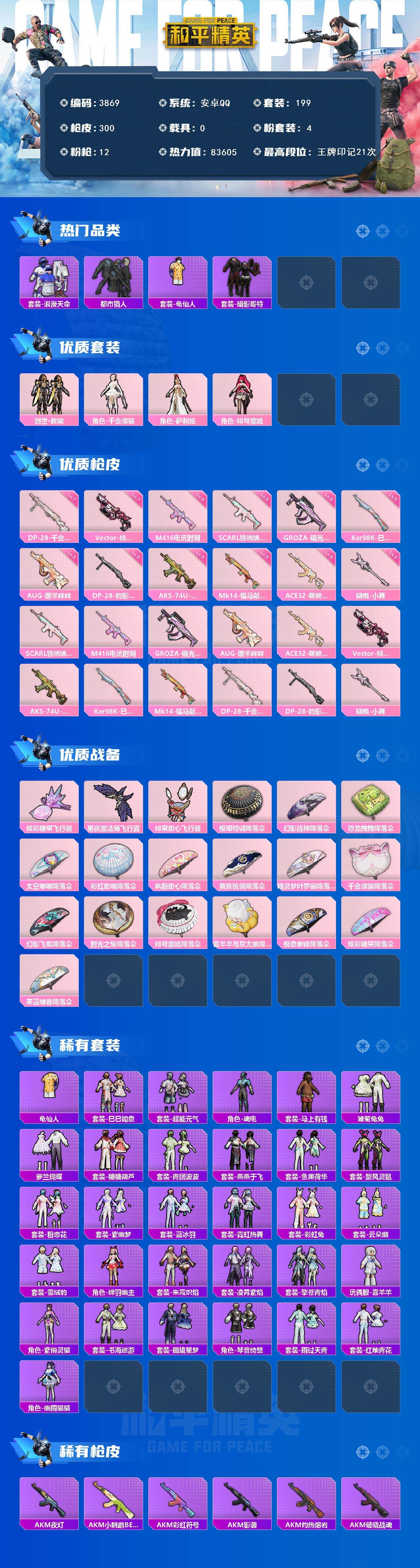 满级地铁 安卓 手Q-4粉装-12特效枪-0载具-3粉色飞行器-83605热力值-21王牌印记-199套装-300枪皮