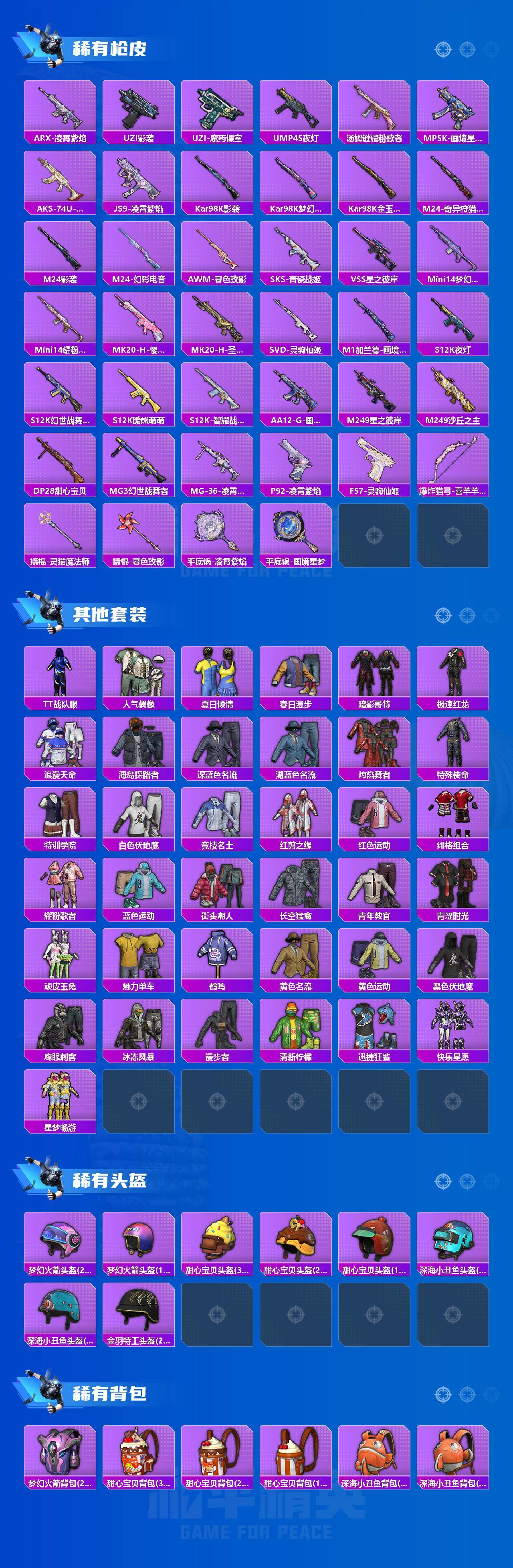 【粉色枪皮等级】:M416-灵猫魔法师(三级),AUG-星之彼岸(四级),ACE32-萌骑漫游(二级),AKS-74U-森灵之息(五级),Kar98K-巳巳如意(五级),Kar98K