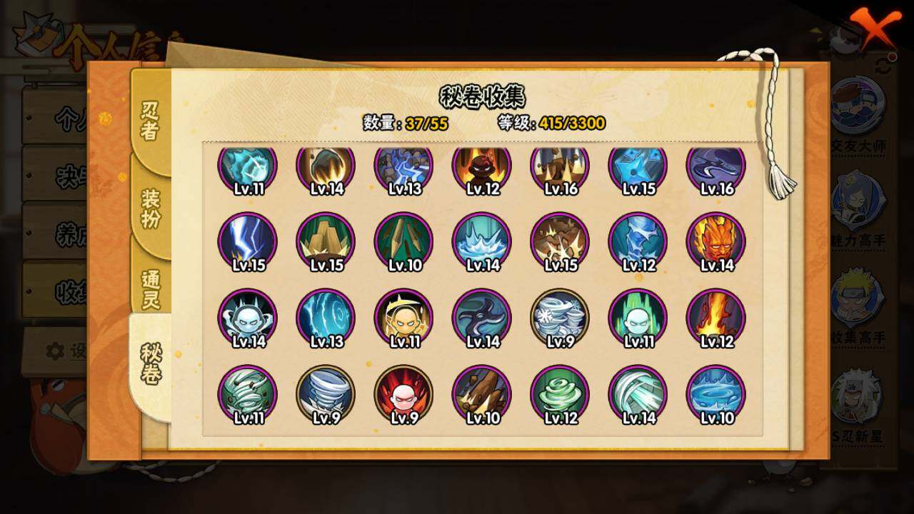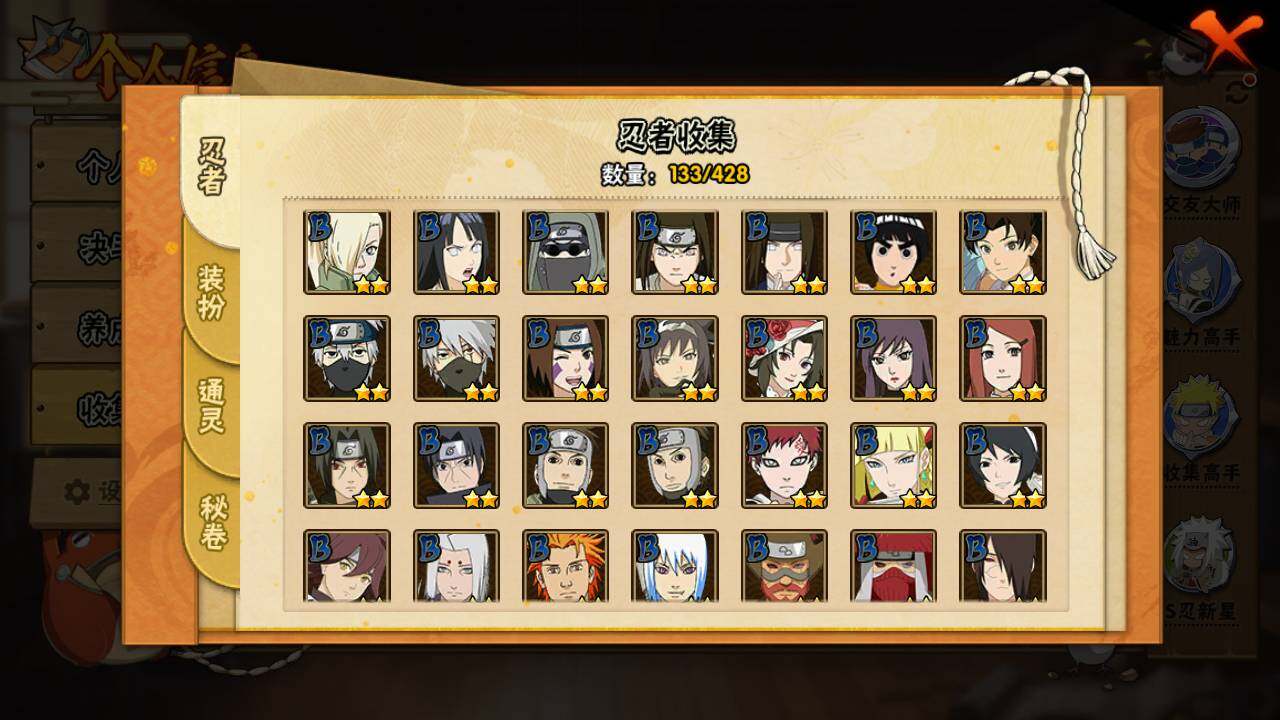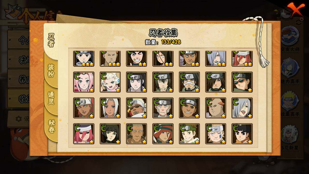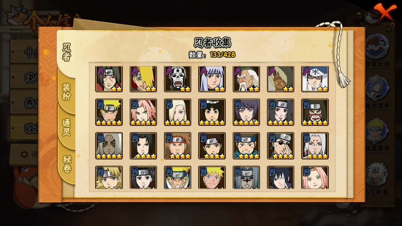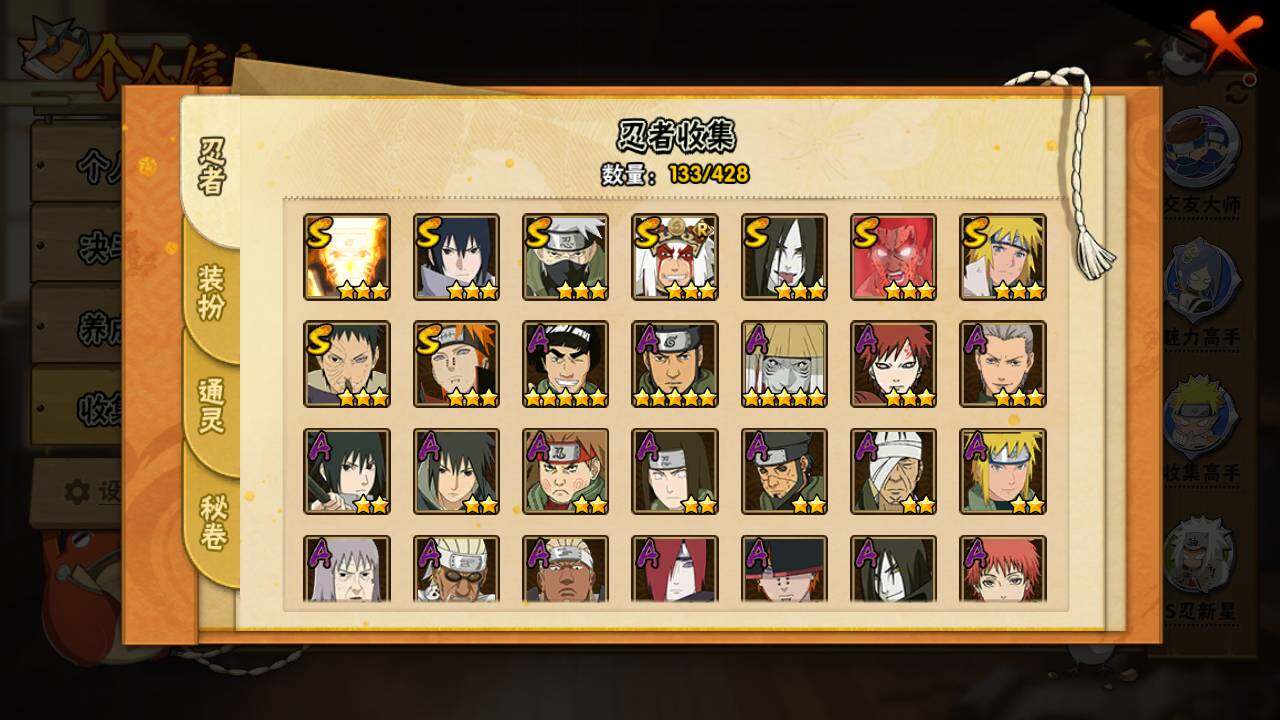 【S级忍者】:宇智波带土「忍界大战」(3星),旗木卡卡西「须佐能乎」(3星),自来也「舞之豪杰」(3星),大蛇丸(3星),波风水门(3星),漩涡鸣人「九喇嘛连结」(3星),迈特凯「死门」(3星),佩恩「天道」(3星),宇智波佐助「永恒万花筒」(3星)