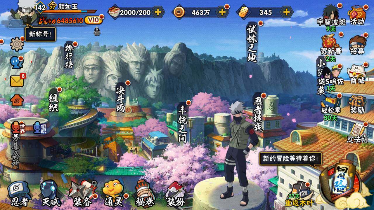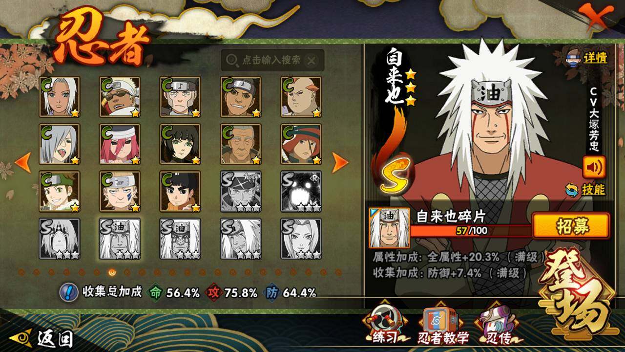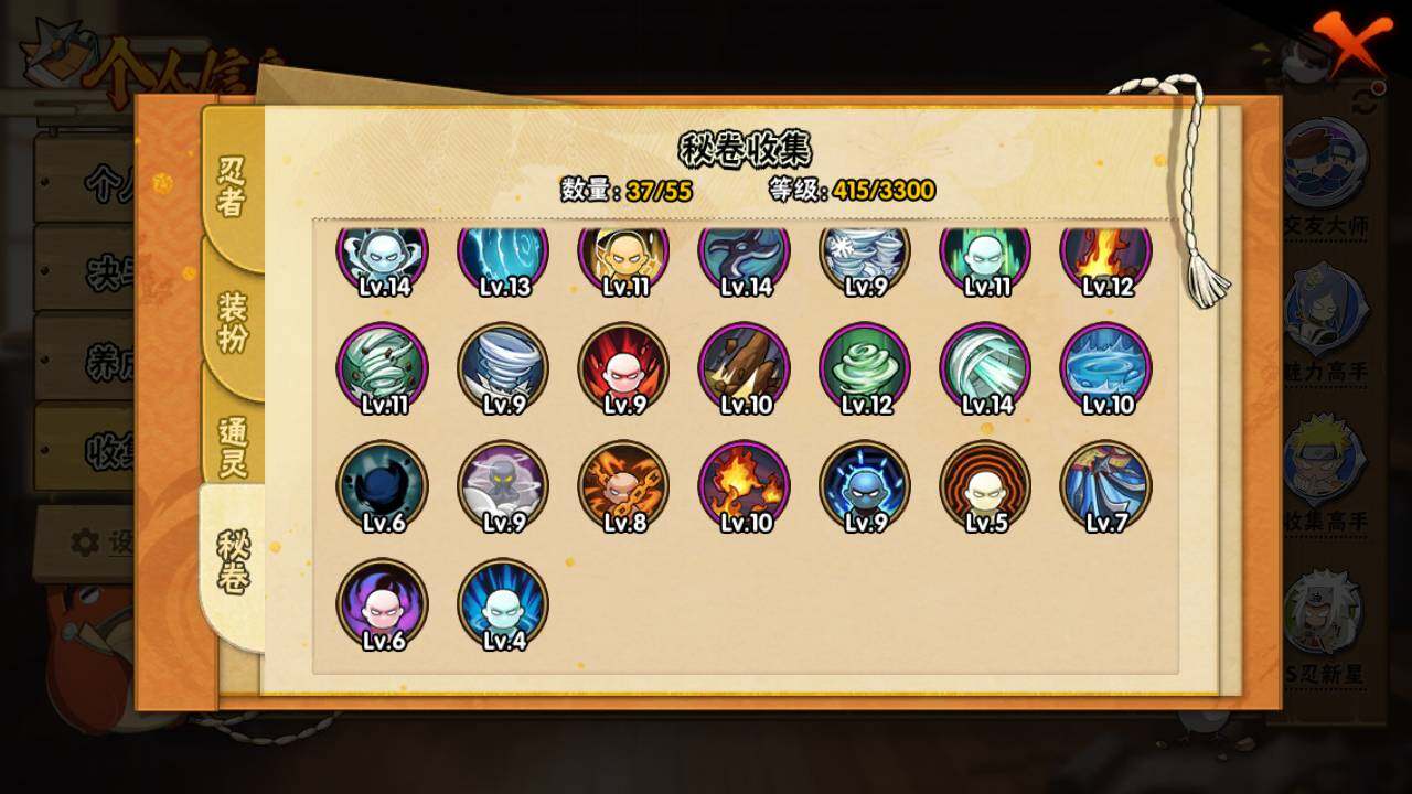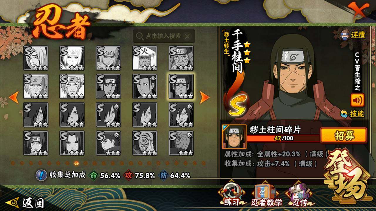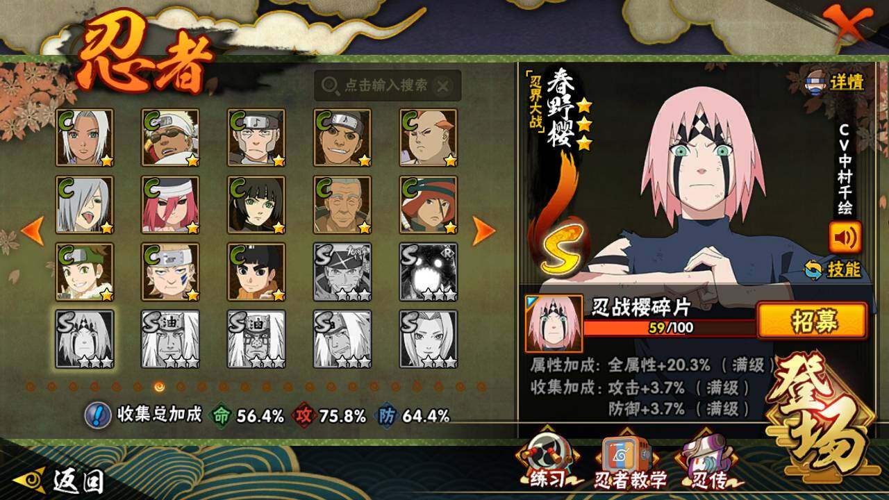 【S级忍者】:宇智波带土「忍界大战」(3星),旗木卡卡西「须佐能乎」(3星),自来也「舞之豪杰」(3星),大蛇丸(3星),波风水门(3星),漩涡鸣人「九喇嘛连结」(3星),迈特凯「死门」(3星),佩恩「天道」(3星),宇智波佐助「永恒万花筒」(3星)