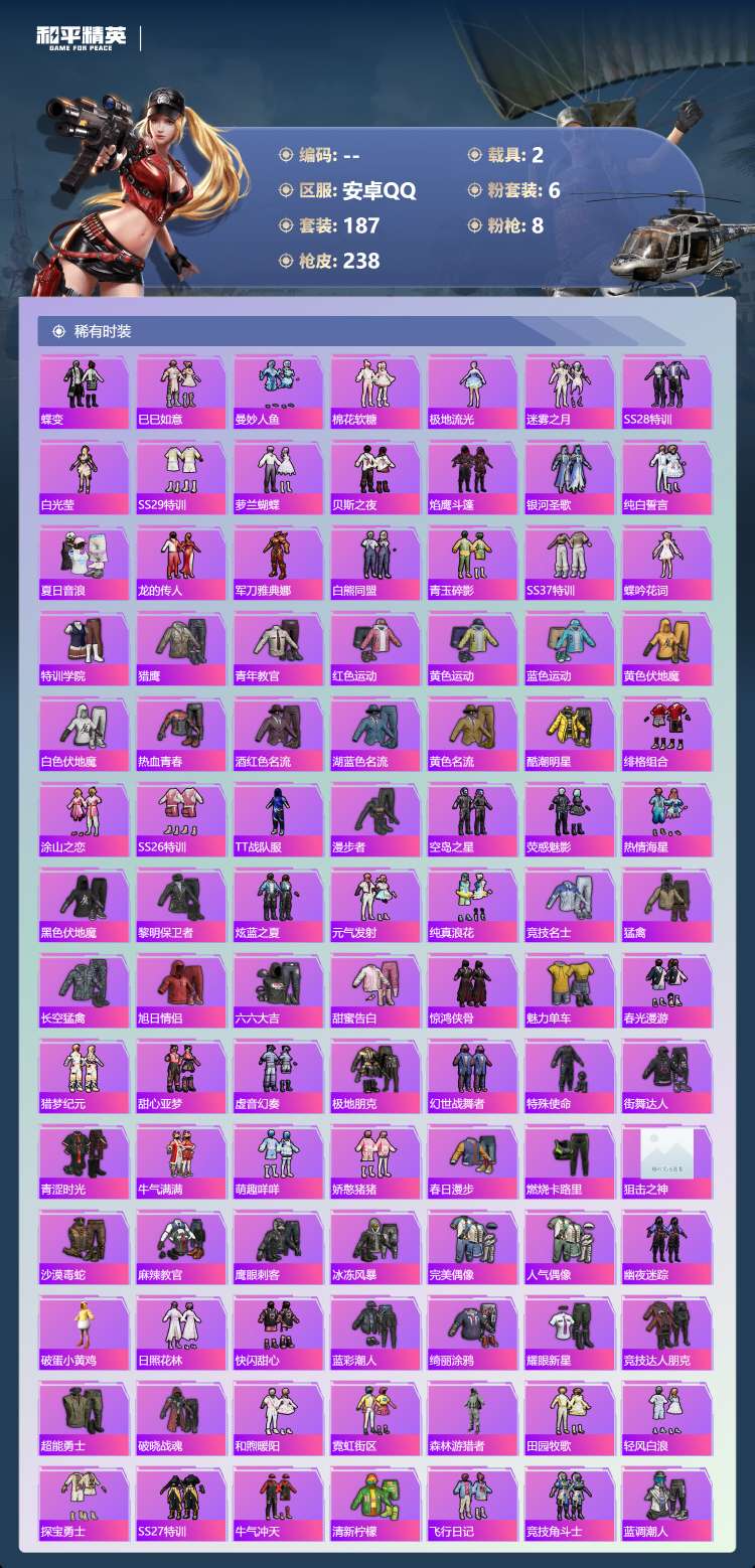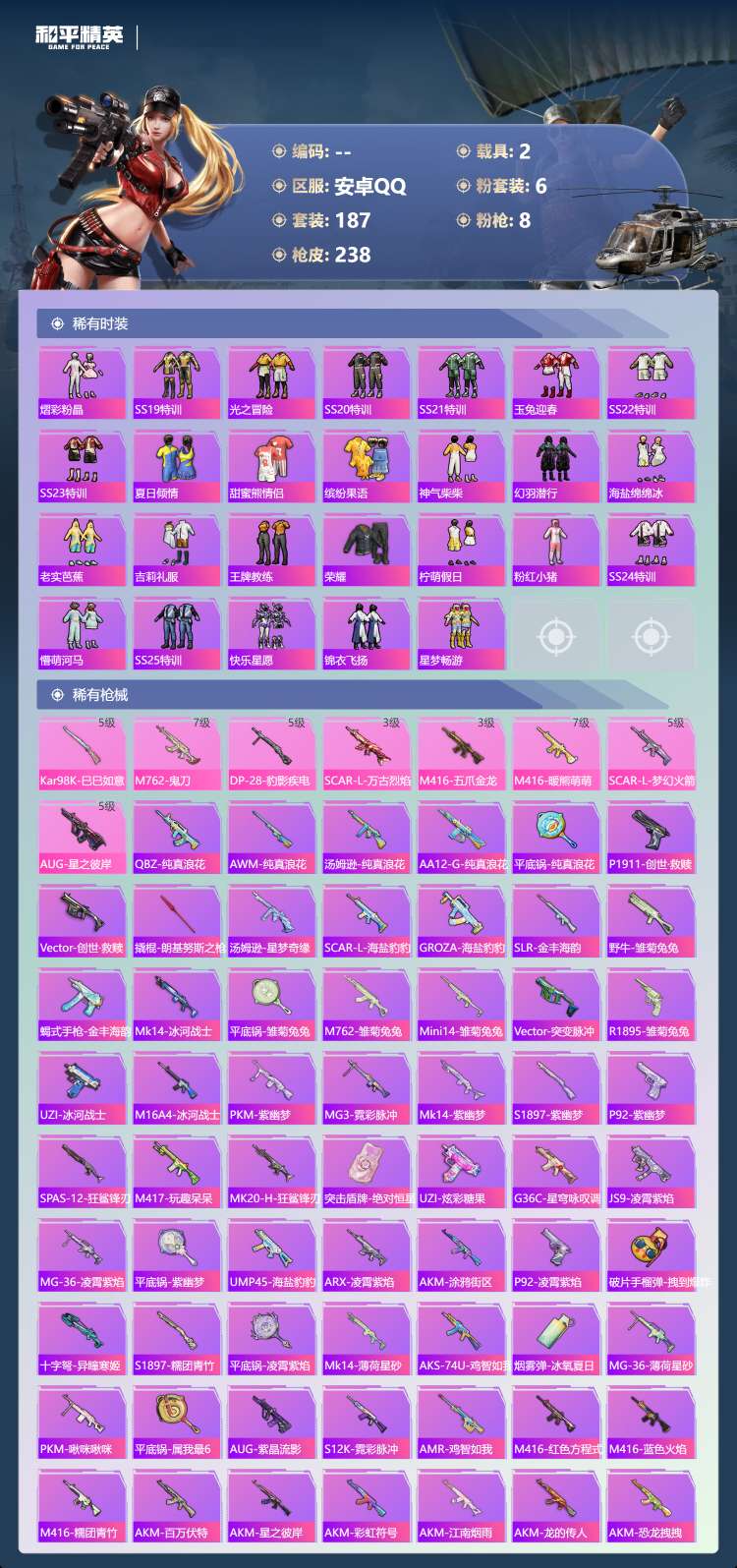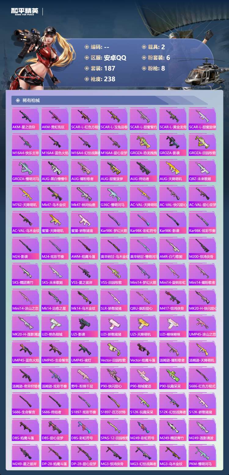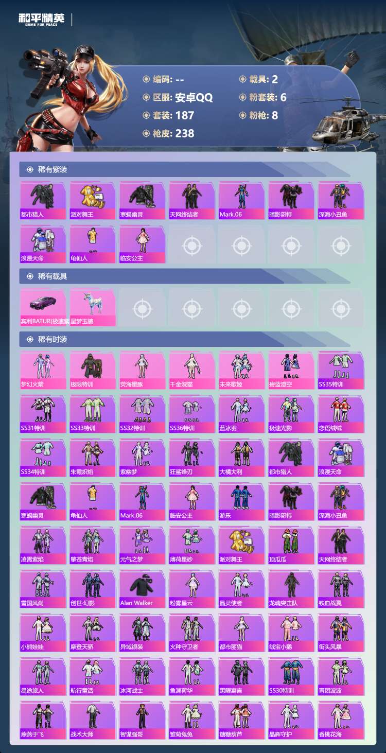 hs62975 安卓手Q-16王牌印记-6粉装-8特效枪-2载具-81078热力值-187套装-23