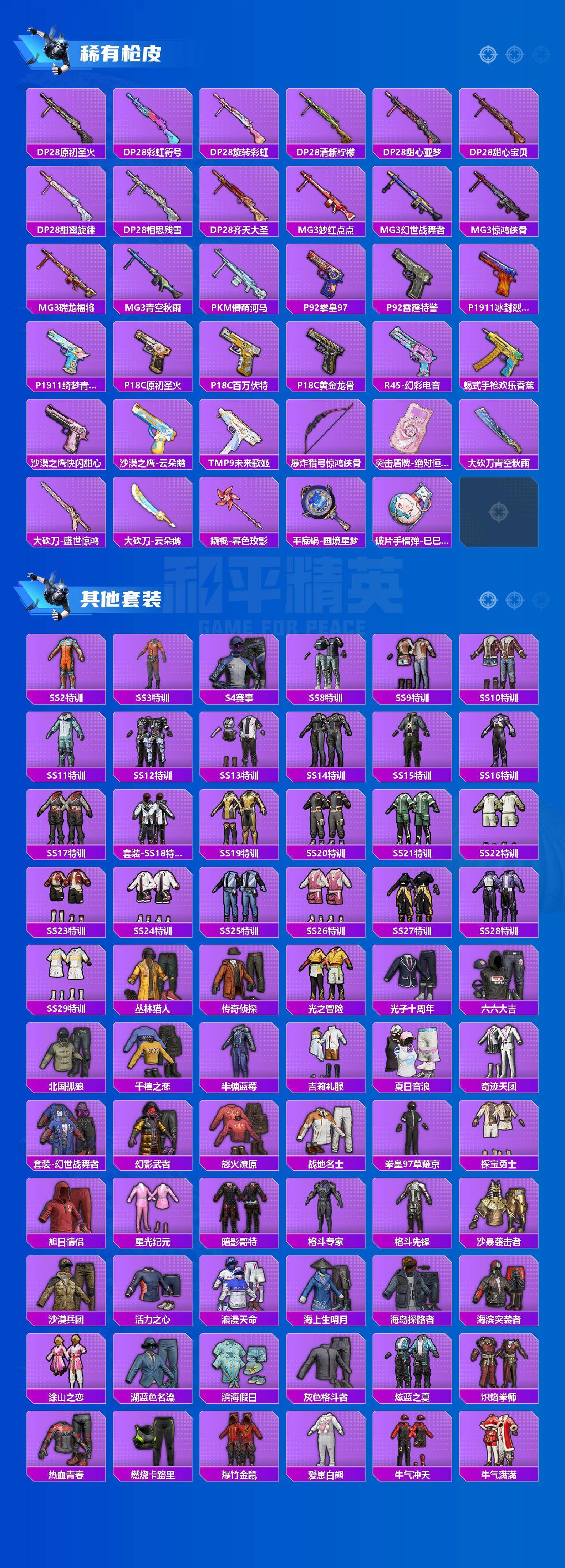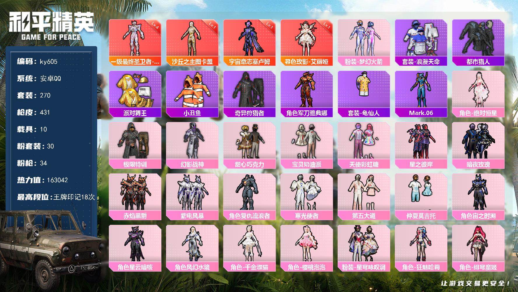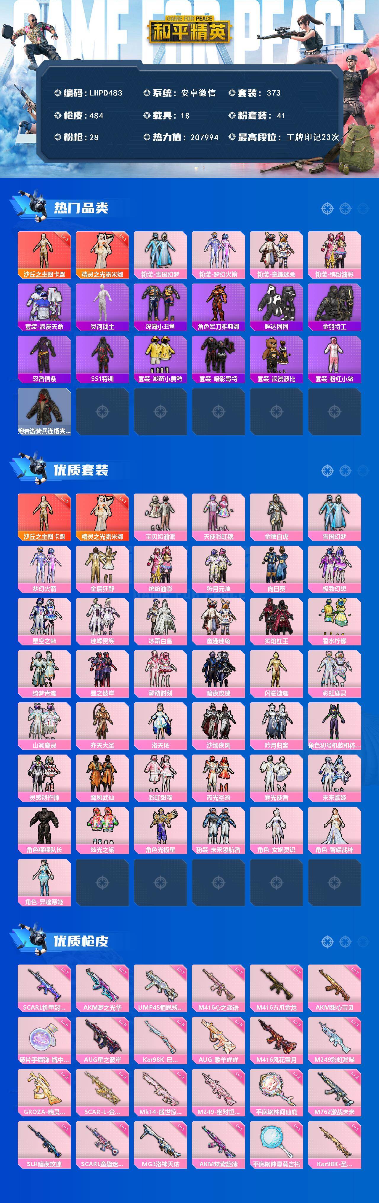 【特价出售/店主推荐】安卓 微信-2神装-41粉装-28特效枪-18载具-18粉色飞行器-20w热力值-23王牌印记-373套装-484枪皮