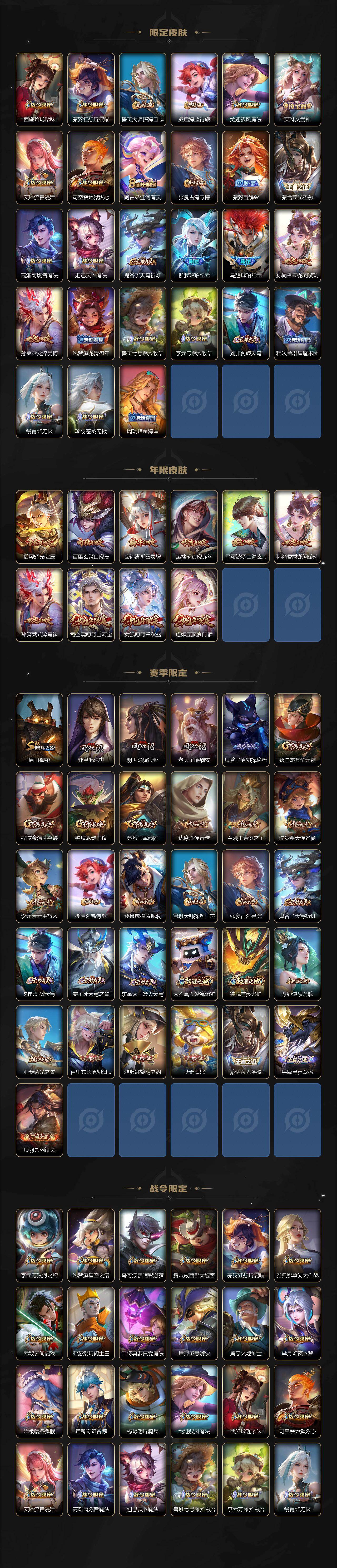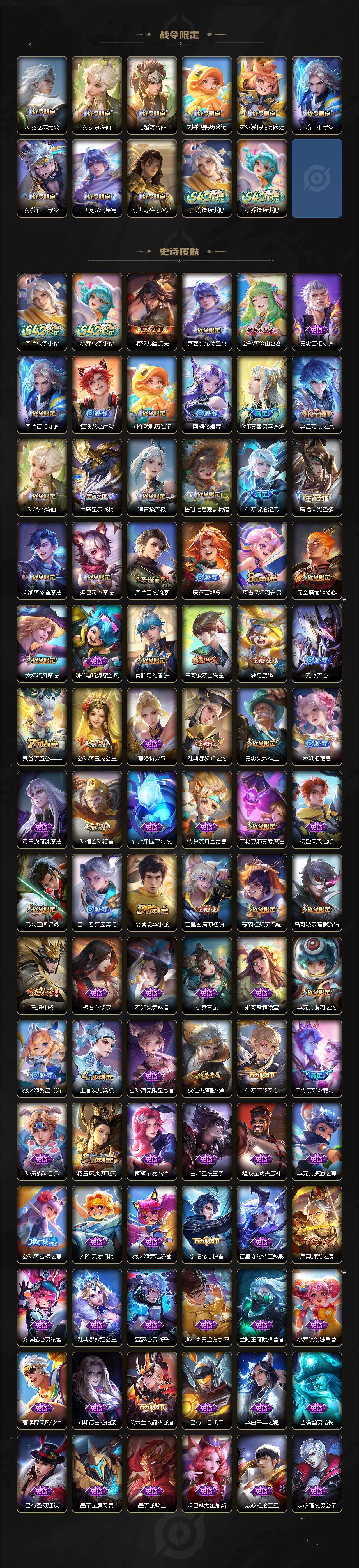 【传说皮肤】:马超神骥逐星野,花木兰异界灵契,后羿神树通天,司空震愿照山河定,女娲愿照千秋盛,虞姬愿