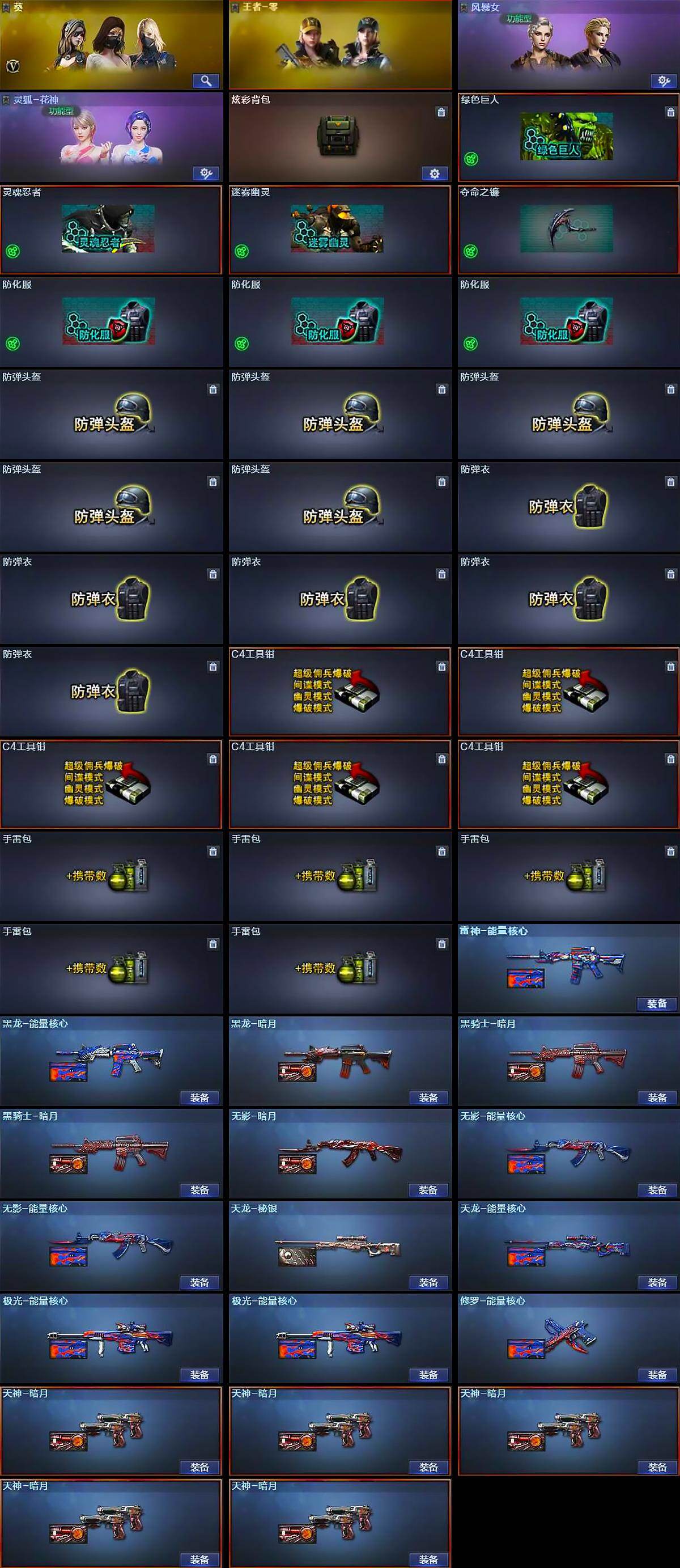 【皮肤】:雷神-能量核心,黑龙-能量核心,黑龙-暗月,黑骑士-暗月*2,无影-暗月,无影-能量核心*2,天龙-秘银,天龙-能量核心,极光-能量核心*2,修罗-能量核心,天神-暗月*5