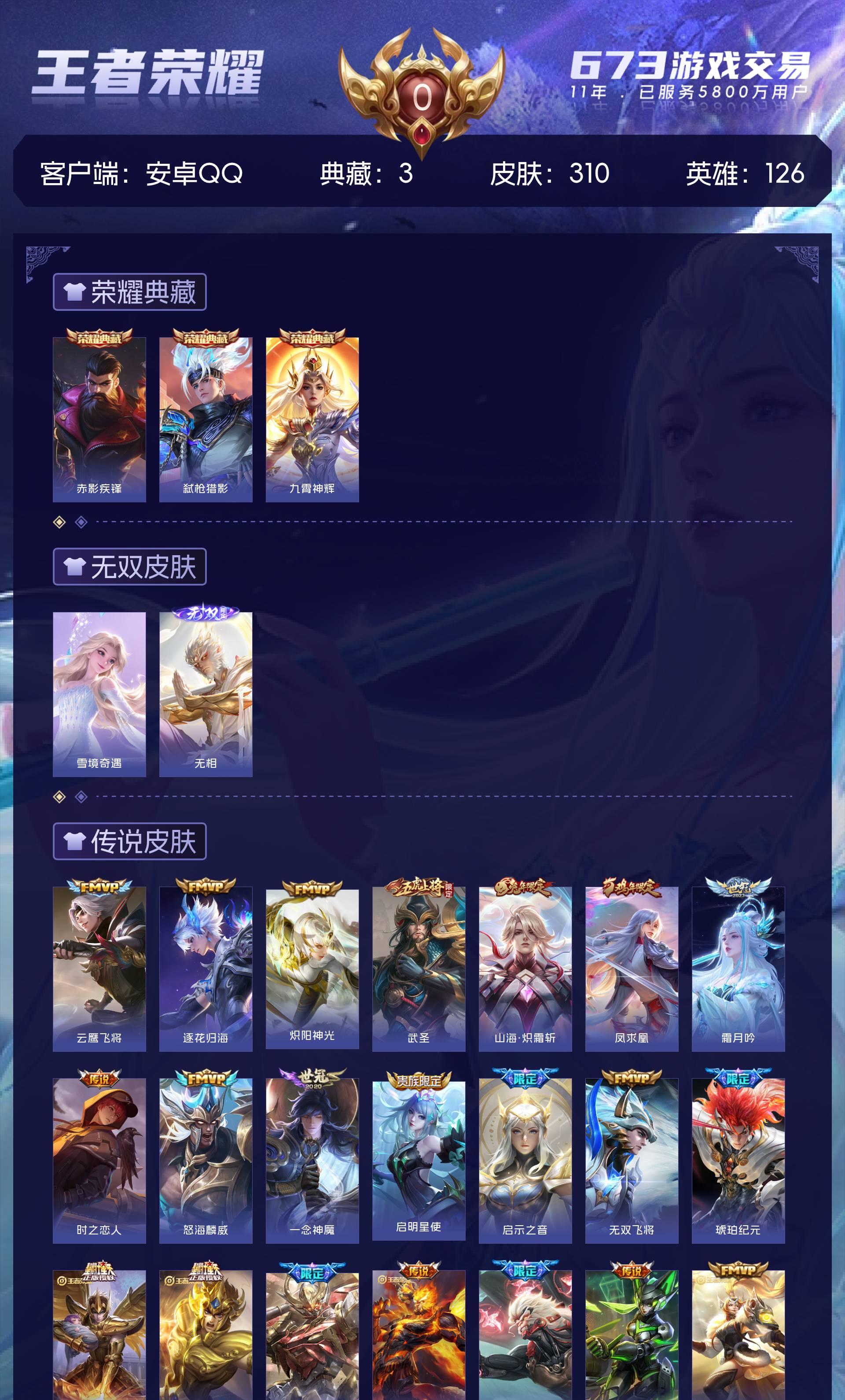 安卓QQ V8 可二次,皮肤310 荣耀王者 荣耀典藏3 无双皮肤2 传说27 星传说3 多限定