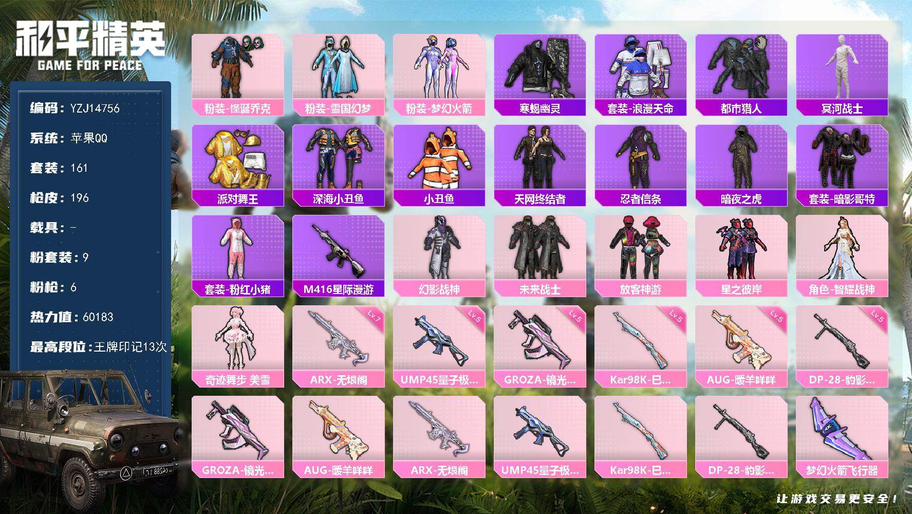 2439767_实名可改苹果Q-8稀有9粉装6特效枪18热门161套装196枪皮60183热力值极品身法素材号M4星际小丑冰雪木乃伊新101都市寒蝎金鞋天网暗夜之虎浅蓝色牛仔衬衣幻影战神星之彼岸LED发光眼罩红眼罩红面罩(幽冥伯爵)阳光菠萝深海小丑鱼鲨鱼服东方飞龙天命4AM战队服国宝头盔雪国背包满级ARX无垠阁满级AUG暖羊13印记历史传奇王牌20星【8稀有】木乃伊寒蝎幽灵M416-星际漫游都市猎