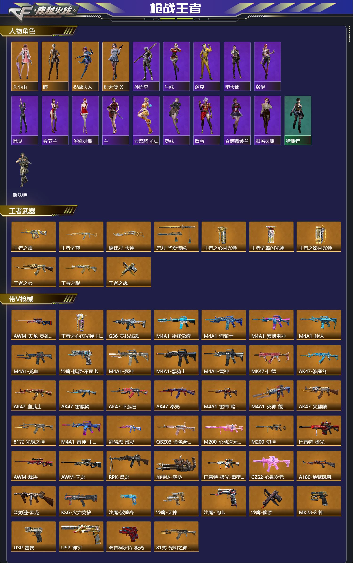【人物角色】孙悟空,牛妹,洛克,关小雨,瞳,大老师,洛伊,暗影,春节兰,圣诞灵狐,兰,灵狐者,猎狐者,斯沃特,刀锋-枪战王者,祝融夫人,炽天使-X,武媚-X,云悠悠-心动起点,奥妹,蜀雪,变装舞会兰,职场灵狐,