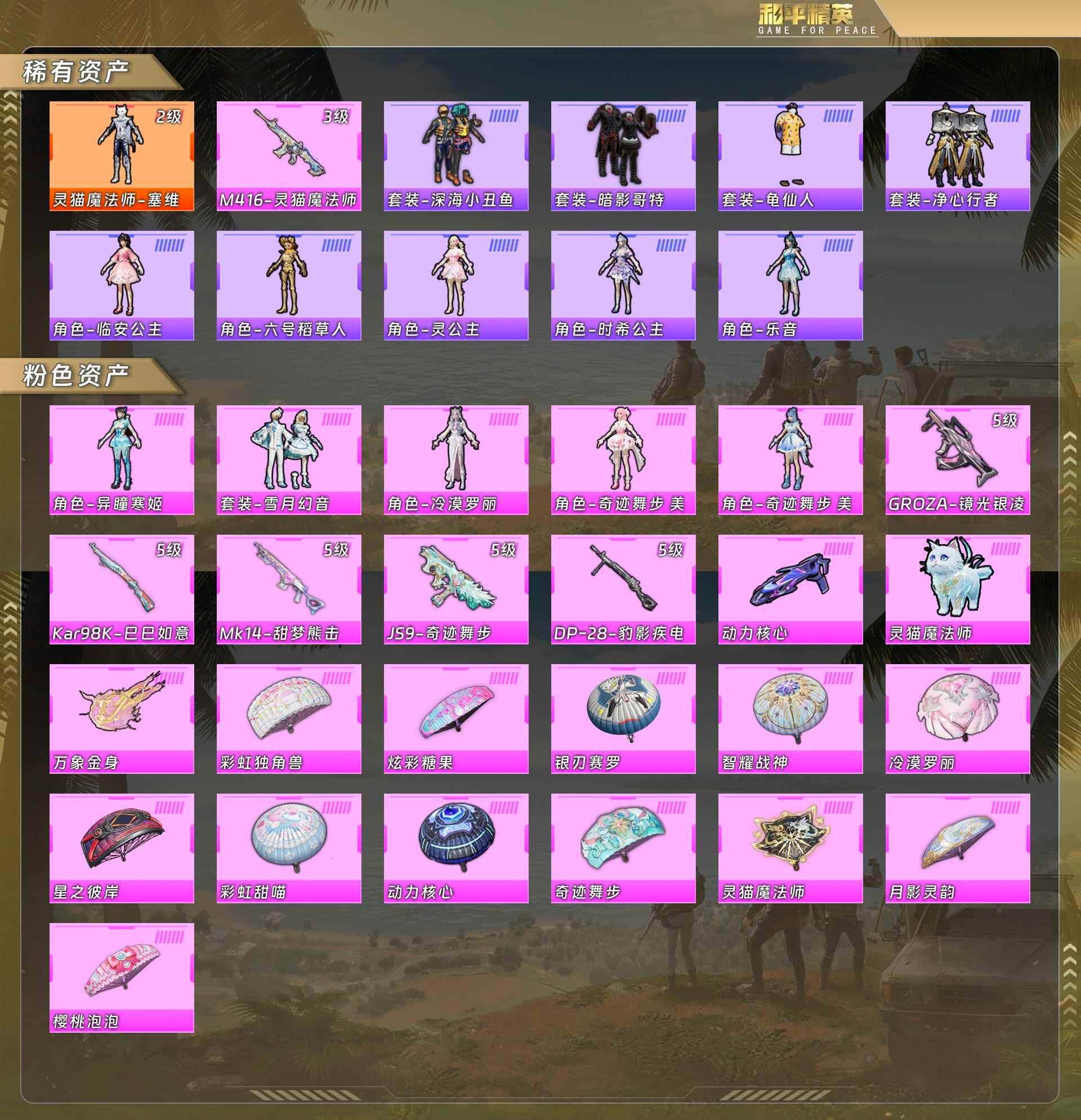 身法号-灵猫魔法师-塞维尔[2级]/M416-灵猫魔法师[3级]/深海小丑鱼/暗影哥特/净心行者/六号稻草人/异瞳寒姬/雪月幻音/冷漠罗丽/奇迹舞步美雪/奇迹舞步美琪/GROZA-镜光银凌[5级]/Kar98K-巳巳如意[5级]/Mk14-甜梦熊击[5级]/JS9-奇迹舞步[5级]/DP-28-豹影疾电[5级]/没战神框 hp4941