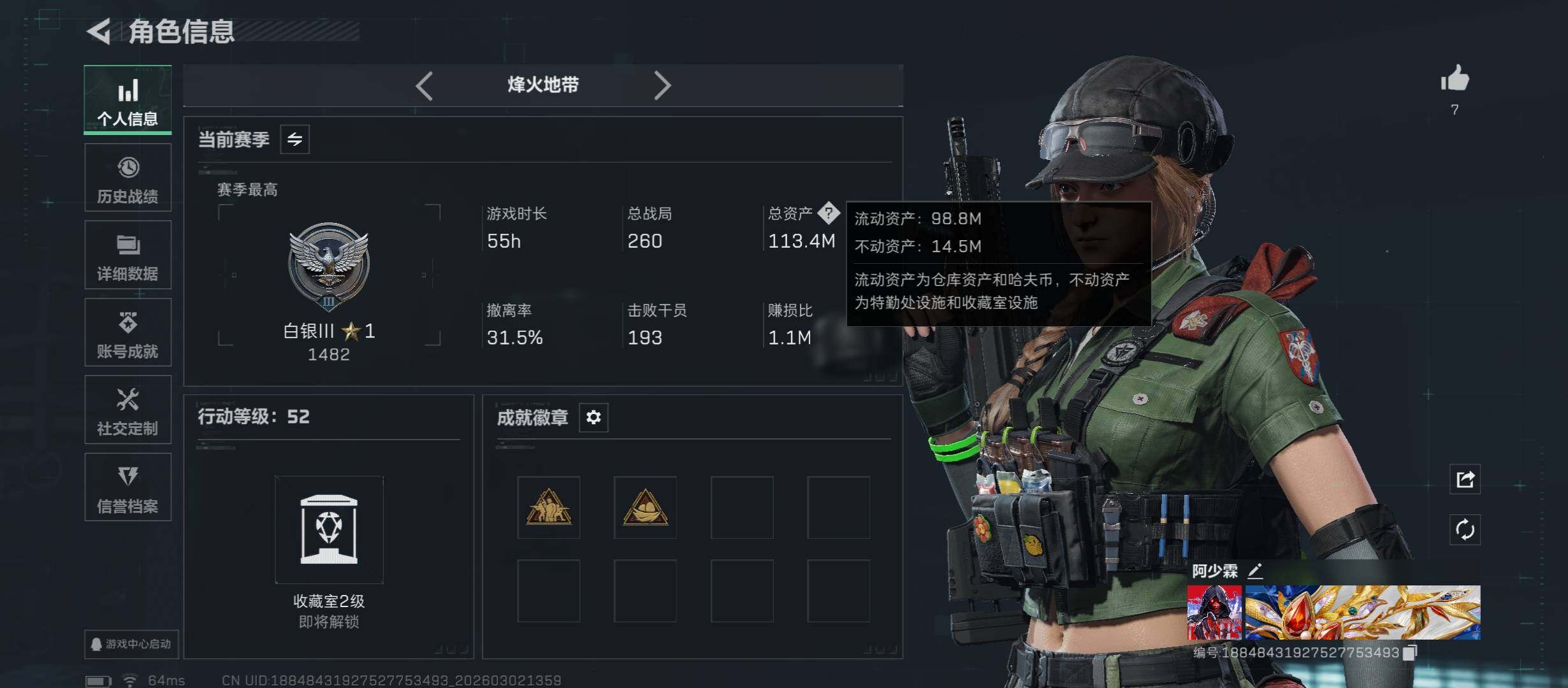 【热门组合搭配:单红+单刀,凌霄戍卫+暗星】【Q区三端互通】【【无二次协助处理】】YXz8860-特勤处:仓库7级/靶场5级/训练中心6级-总资产113.4m-哈夫币58w-烽火等级:52级