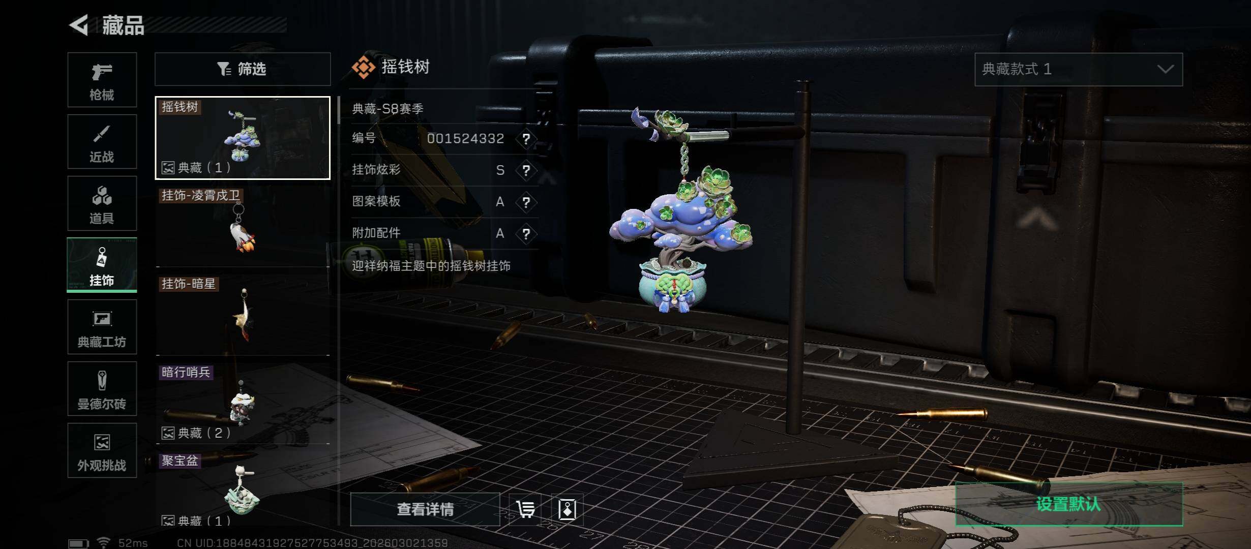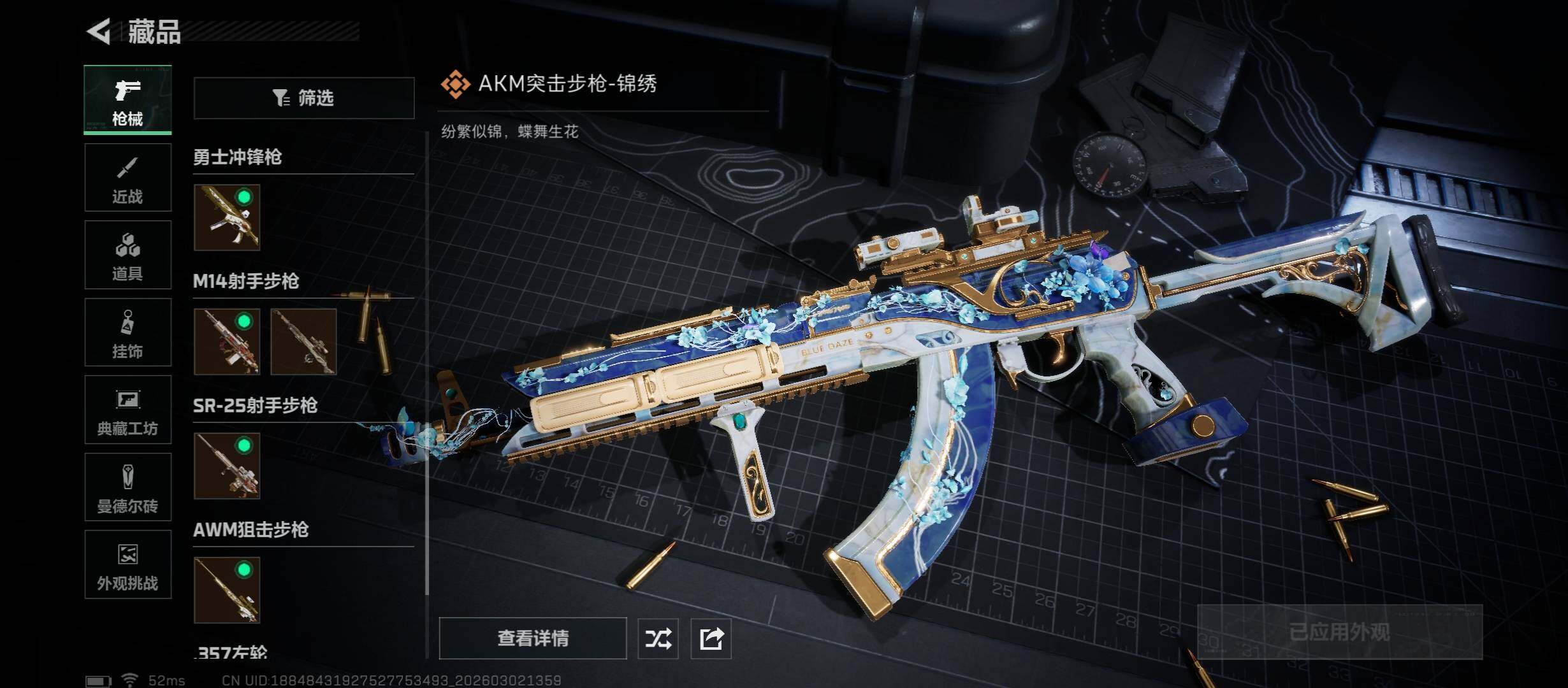 【传说外观】:AKM突击步枪-锦绣,QBZ95-1突击步枪-凌霄戍卫,K416突击步枪-行动记录,腾龙突击步枪-马年祥瑞,腾龙突击步枪-万金泪冠,K437突击步枪-锦绣,MK47突击步枪-暗星,SMG-45冲锋枪-锦绣,S