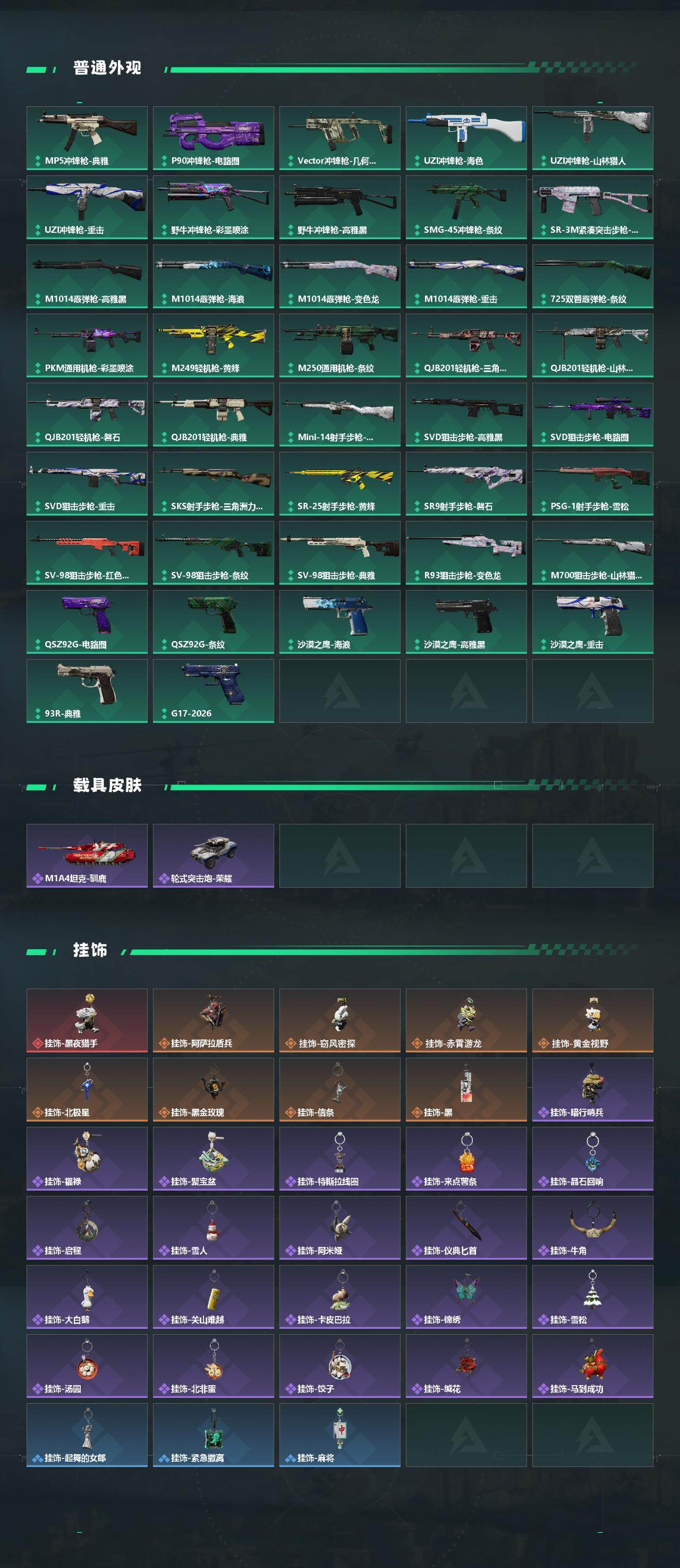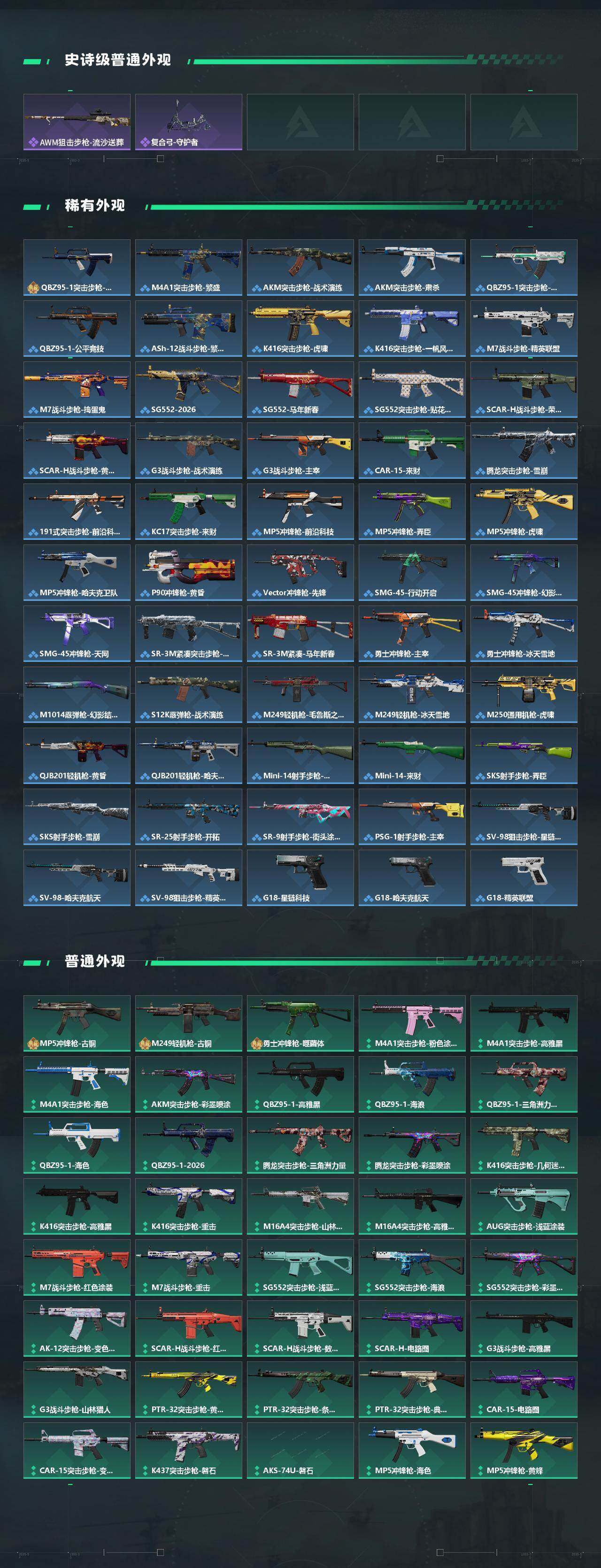 【近战皮肤】:近战-北极星,近战-信条,近战-影锋,近战-怜悯,近战-赤枭,近战-龙牙,近战-处刑者2级,近战-黑鹰