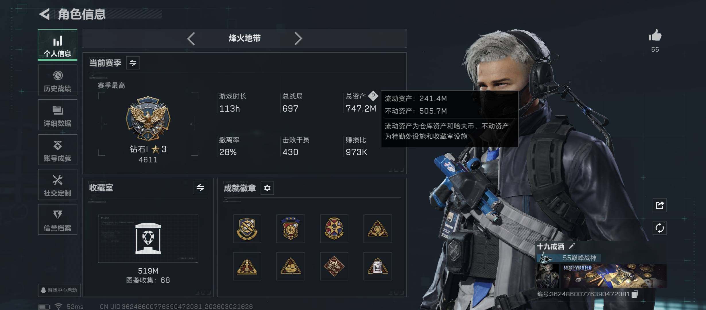 【高氪金土豪号-单红皮+七刀皮+二典藏皮肤.高额资产747M】【北极星.信条.影锋.怜悯.赤枭.龙牙.处刑者.蚀金玫瑰】【Q区三端互通】【无二次】YXz8866-特勤处:仓库10级/靶场7级/训练中心7级-总资产747.2m-哈夫币229w-烽火等级:60级