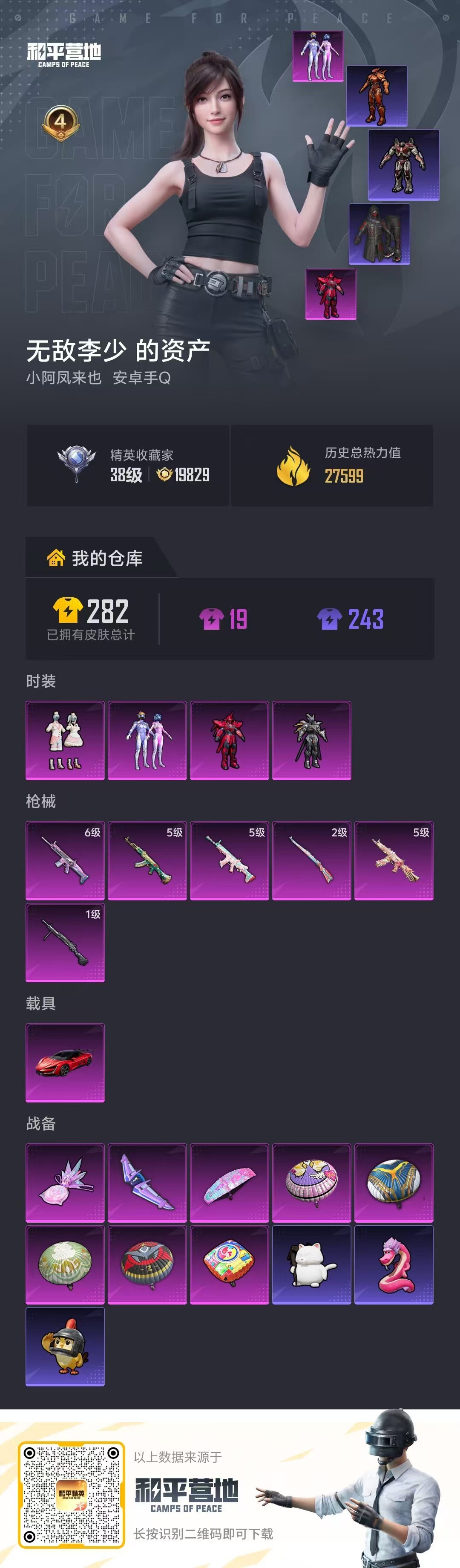 hs62998 安卓手Q-4王牌印记-4粉装-6特效枪-1载具-27599热力值-57套装-84枪皮