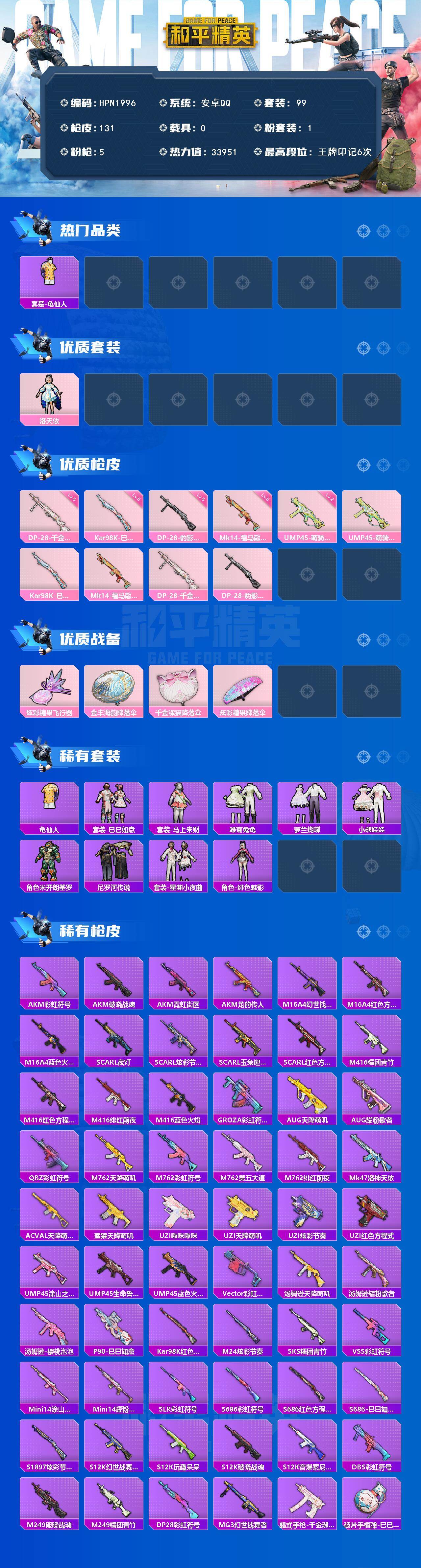 【HPN1996】99套装/枪械5/装备135/战备78/王牌印记6/热力值33951/二级UMP45-萌骑冒险/五级Kar98K-巳巳如意/五级Mk14-福马献瑞/五级DP-28-千金淑猫/五级DP-28-豹影疾电/套装-龟仙人/洛天依/UMP45-萌骑冒险/Kar98K-巳巳如意/Mk14-福马献瑞/DP-28-千金淑猫/DP-28-豹影疾电/炫彩糖果飞行器/金丰海韵降落伞/千金淑猫降落伞/炫彩糖果降落伞/龟仙人/巳巳如意/套装-雪国风尚/套装-炫彩糖果/套装-马上来财/雏菊兔兔/萝兰蝴蝶/