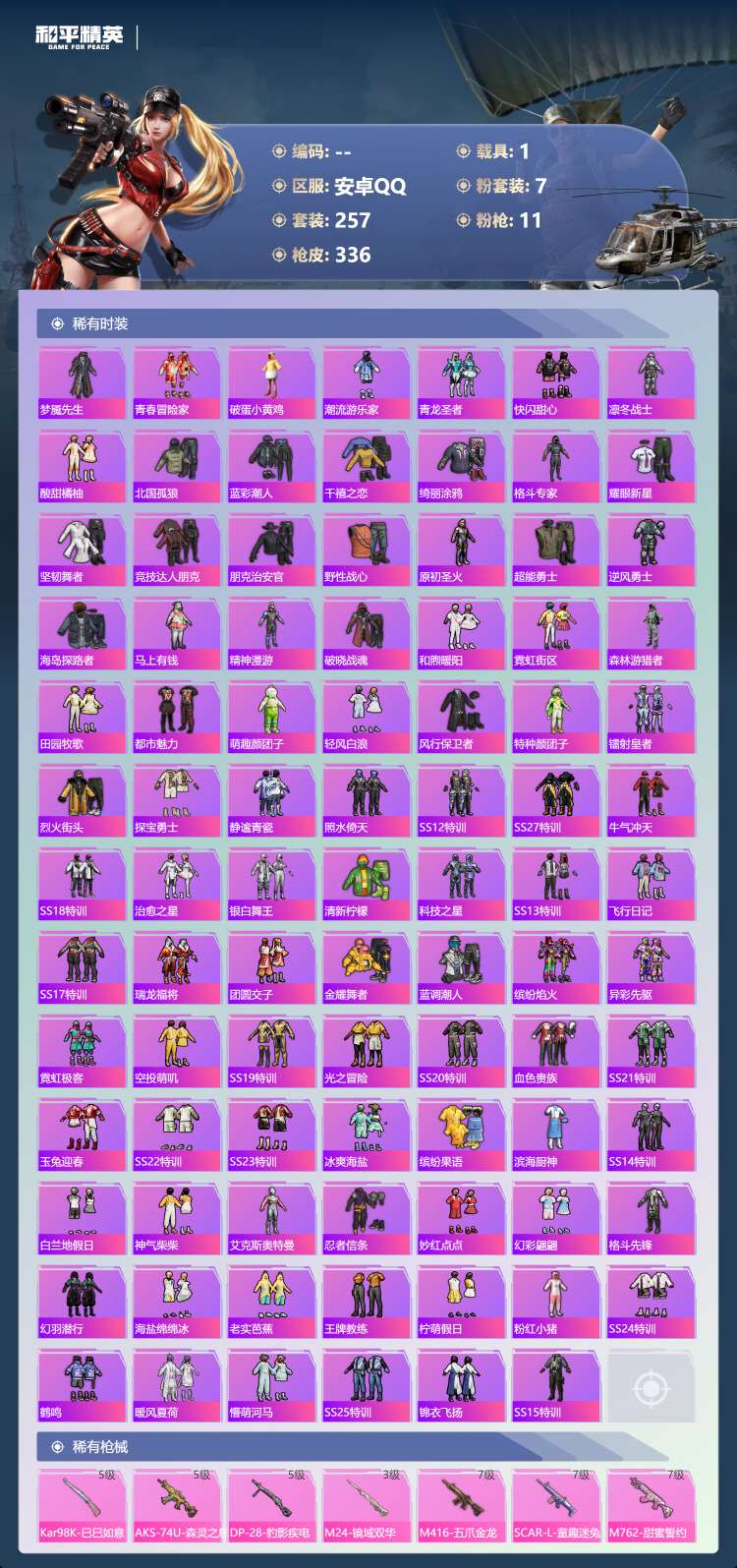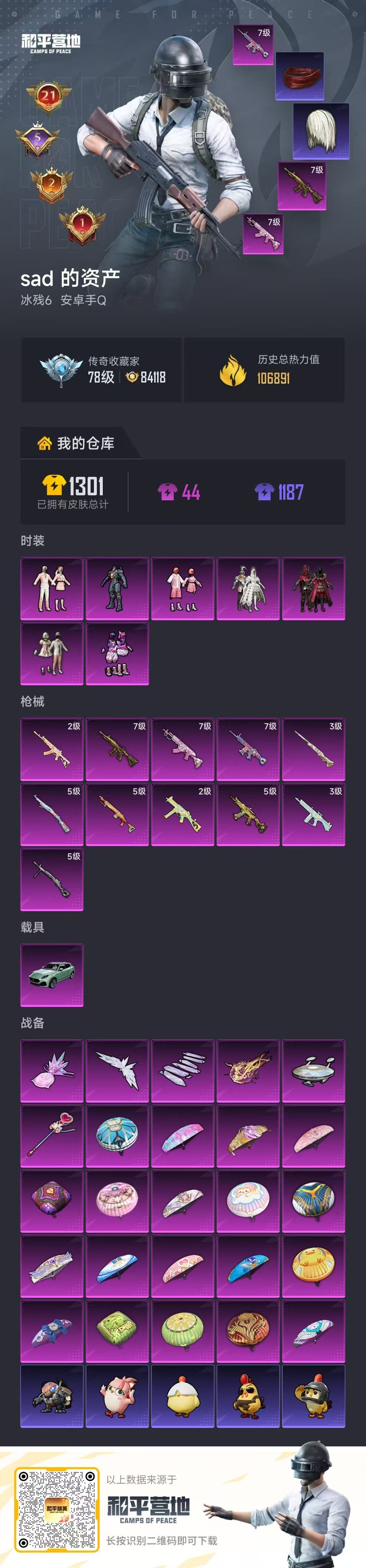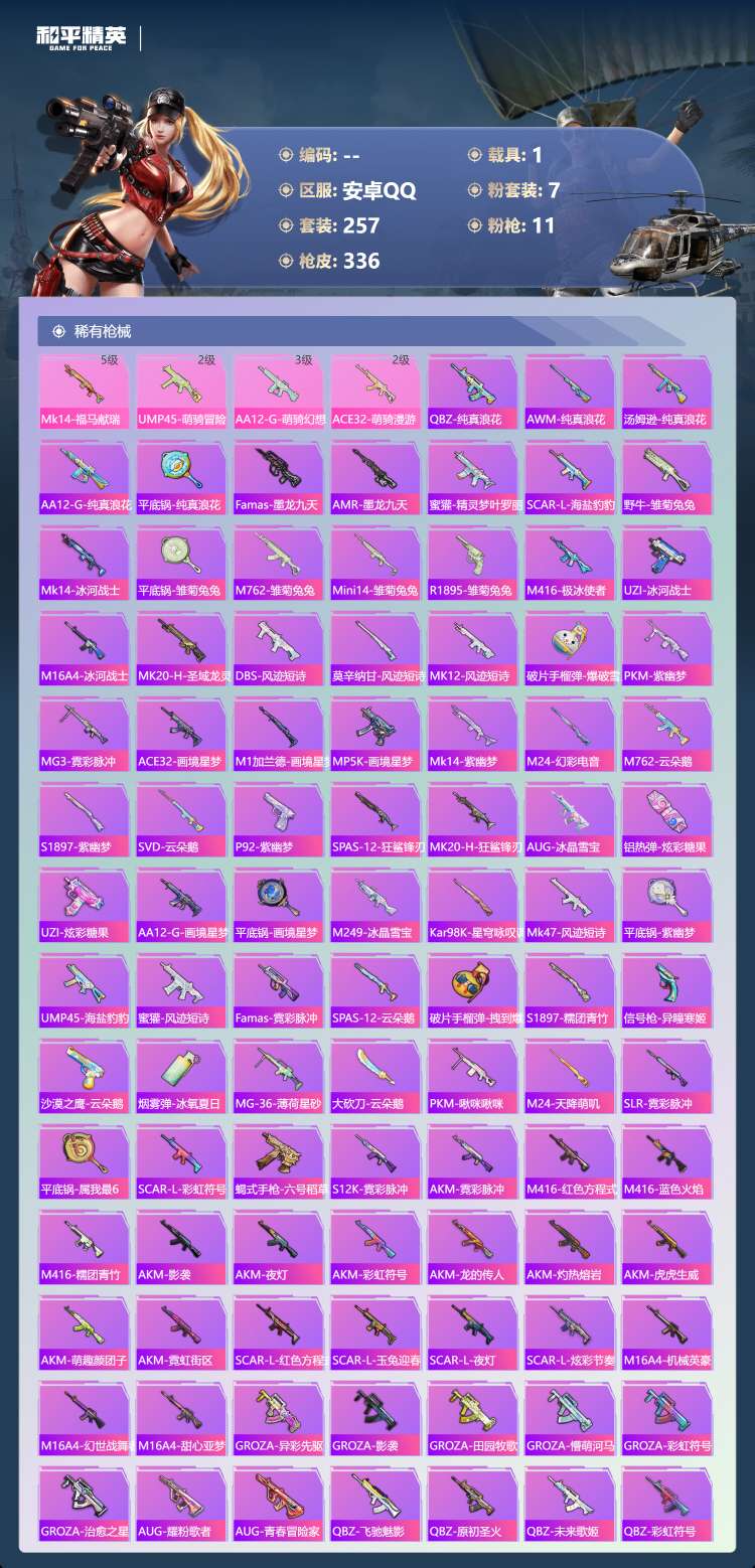 hs62969 安卓手Q-21王牌印记-有战神框-7粉装-11特效枪-1载具-106891热力值-2