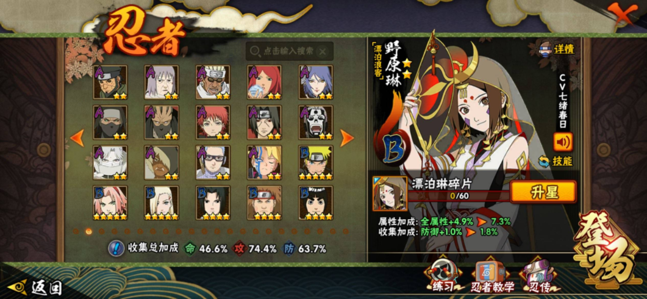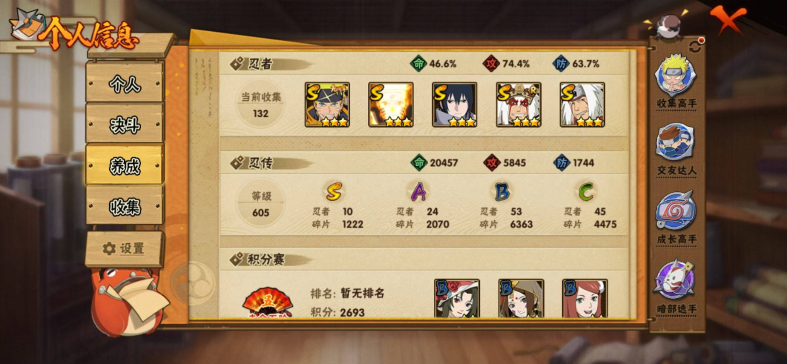 【S级忍者】自来也「传说中的三忍」(3星),宇智波斑「秽土转生·解」(3星),宇智波佐助「永恒万花筒」(3星),漩涡鸣人「九喇嘛连结」(3星),千手扉间「秽土转生」
