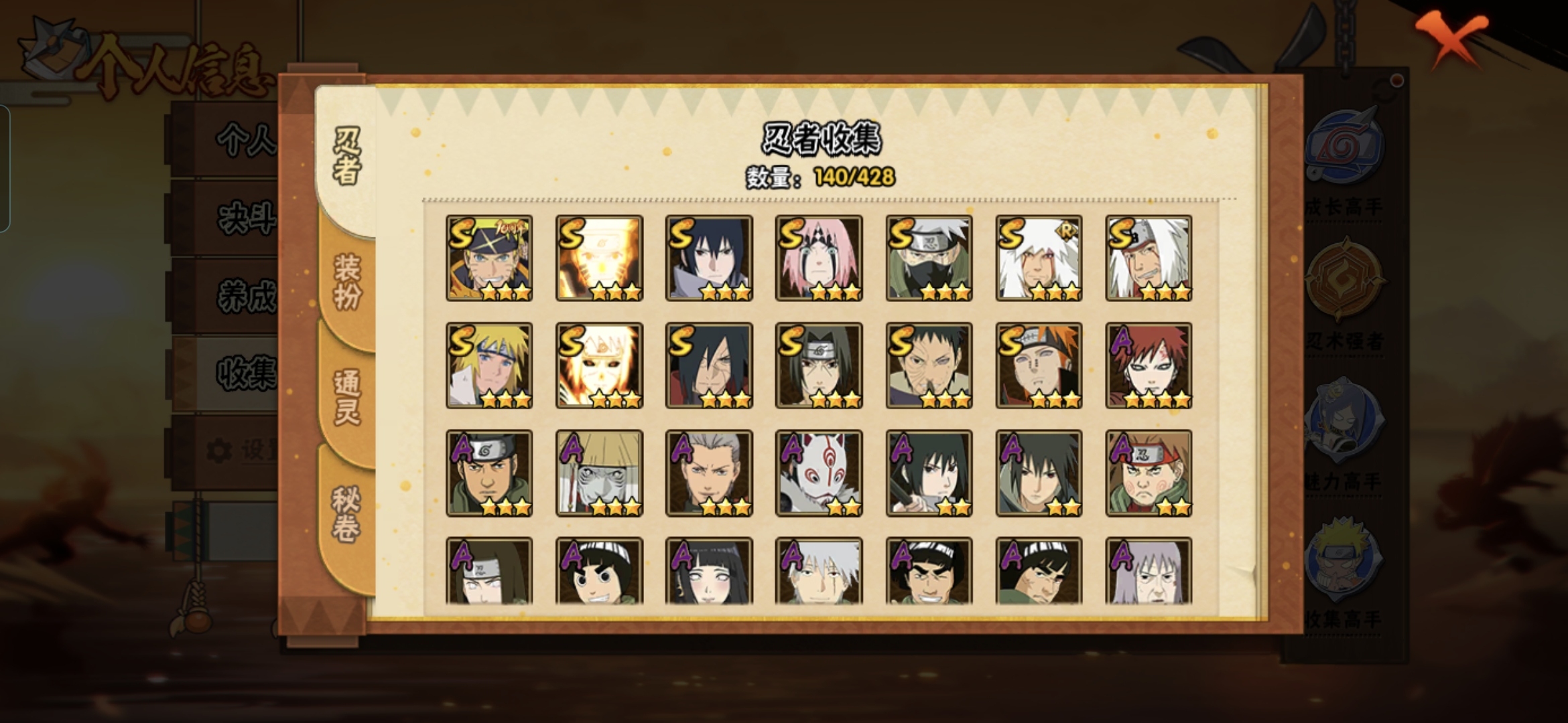 MHY3975【S忍者13 A忍者26 通灵15】【安卓Q-2217区-144级-V5-681万战力】【S级】旗木卡卡西「须佐能乎」 宇智波鼬「须佐能乎」 波风水门 漩涡鸣人「九喇嘛连结」 宇智波斑「秽土转生·解」 佩恩「天道」 波风水门「九喇嘛连结」 宇智波带土「忍界大战」 自来也「舞之豪杰」 漩涡鸣人·宇智波佐助 自来也「传说中的三忍」 春野樱「忍界大战」 宇智波佐助「永恒万花筒」【A级】宇智波佐助「须佐能乎」 日向宁次「忍界大战」 大野木「侠隐江湖」 李洛克「忍界大战」 宇智波泉奈 我爱罗