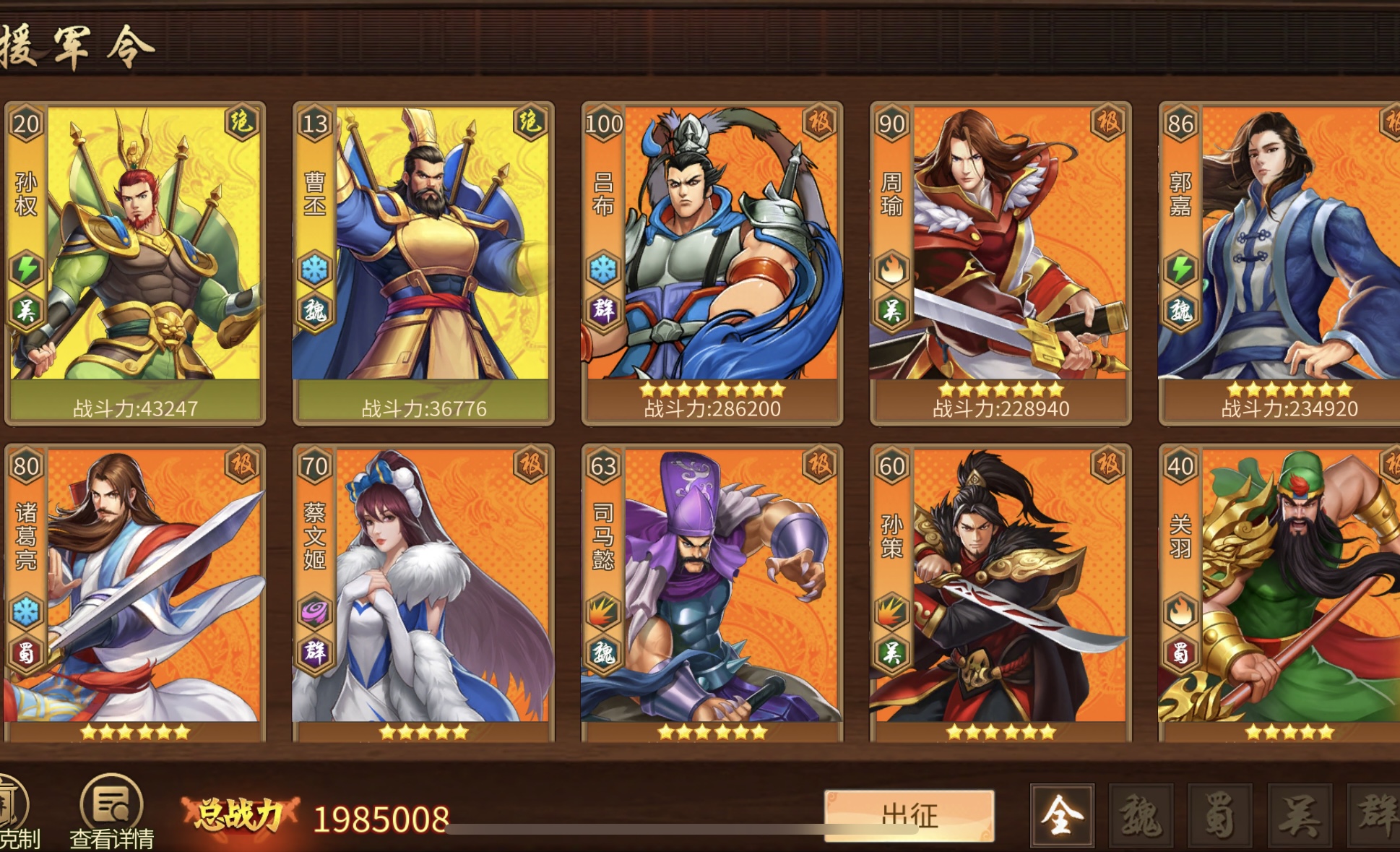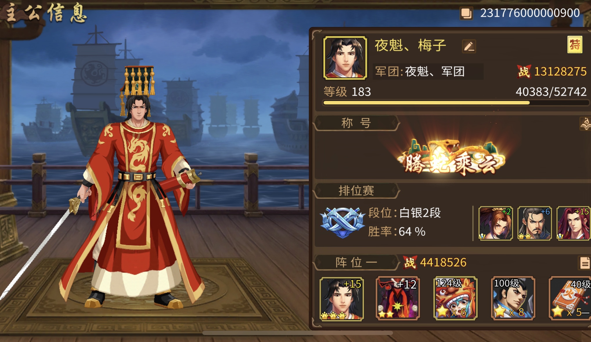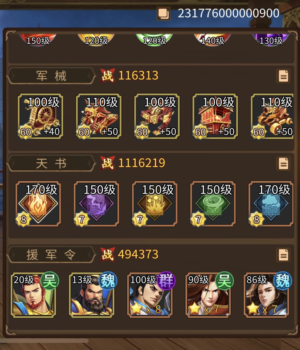 春节4000刚充的8星刘协,援军令7-8星武将一堆,金色孙权也有,兵法5本双攻击,天书高达87778星,高分金色祭石很多,攻击力有82.4万,命中闪避属性非常高排位非常星,300级第四战区总充值55万