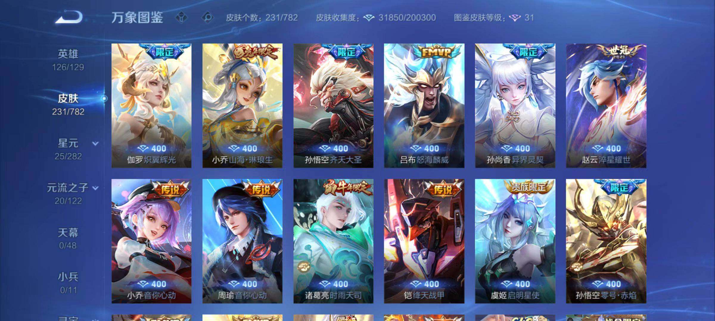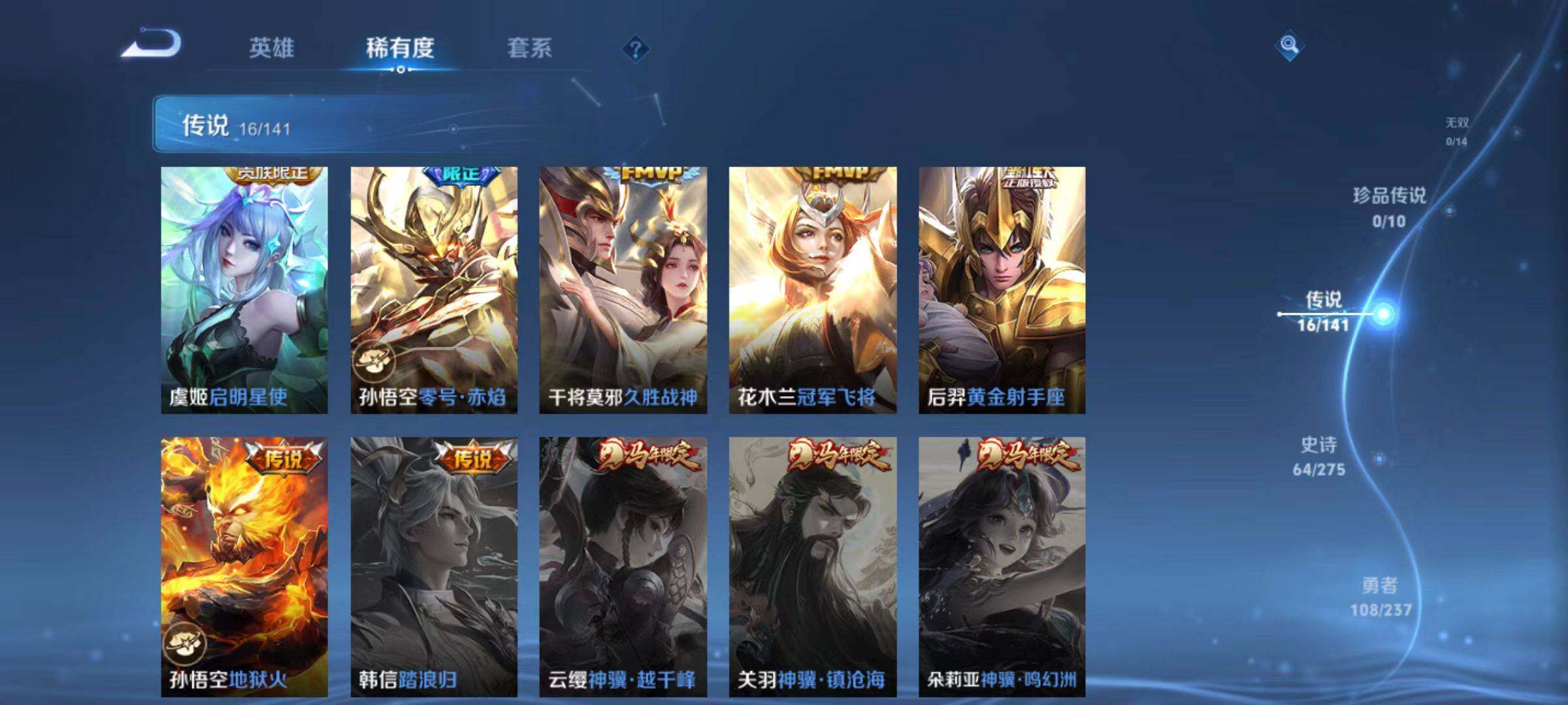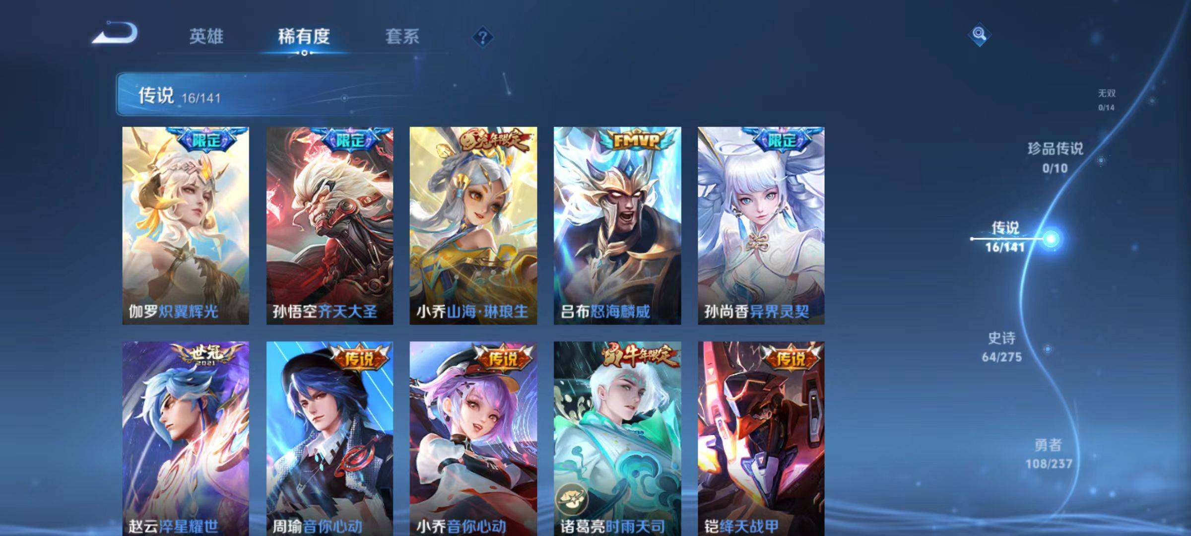 安卓Q-V8-231皮肤-16传说-63史诗【传说皮肤】:伽罗炽翼辉光,孙悟空齐天大圣,小乔山海琳琅生,吕布怒海麟威,孙尚香异界灵契,赵云淬星耀世,周瑜音你心动,小乔音你心动,诸葛亮时雨天司,铠绛天战甲,虞姬启明星使,孙悟空零号赤焰,干将莫邪久胜战神,花木兰冠军飞将,后羿黄金射手座,孙悟空地狱火【限定皮肤】:白起狰,姜子牙天穹之誓,狄仁杰阴阳师,虞姬凯尔特女王,小乔山海琳琅生,赵云皇家上将,赵云龙胆,墨子神迹守卫,妲己时之彼端,孙尚香蔷薇恋人,孙尚香异界灵契,庄周蜃楼王,庄周高山流水,钟无艳超时