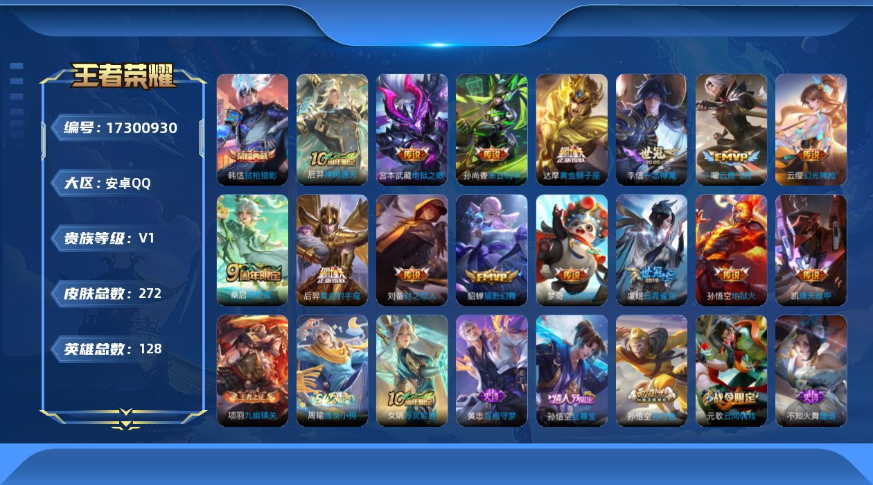 758-[17300930]贵族7-贵族积分37520-272皮1典藏15传说-4个英雄全皮 安卓手Q314区272皮1典藏15传说0无双V0 营地ID1742008288最强王者【荣耀典藏】:弑枪猎影【优质限定皮肤】:至尊宝【传说皮肤】:绛天战甲,胖达荣荣,神树通天,地狱之眼,幻光神枪,鸣野蒿,时之恋人,猫影幻舞,黄金狮子座,云霓雀翎,黄金射手座,云鹰飞将,一念神魔,末日机甲,地狱火【史诗皮肤】:摇滚巨星,九幽镇关,万灵启世,冰冠公主,幽灵船长,百相守梦,女仆咖啡,地狱岩魂,暗夜贵公子,绅