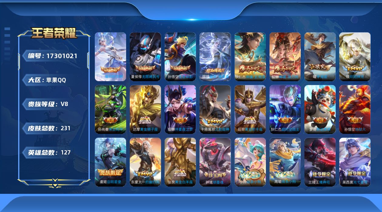 437-[17301021]贵族8-贵族积分84376-231皮3典藏15传说0无双1珍品传说-1个英雄全皮 苹果手Q111区231皮3典藏15传说0无双1珍品传说V8 营地ID1848091428永恒钻石IV【珍品传说皮肤】:器灵·落星盏【荣耀典藏】:最初的交响,无限飓风号,全息碎影【优质限定皮肤】:神骥·赴朔漠,神骥·聚万邦,神威【传说皮肤】:灼幽烈阳,黄金白羊座,神骥·赴朔漠,神骥·聚万邦,炽阳神光,久胜战神,地狱火,启明星使,黄金狮子座,胖达荣荣,超时空战士,仲夏夜之梦,李逍遥 ,黄