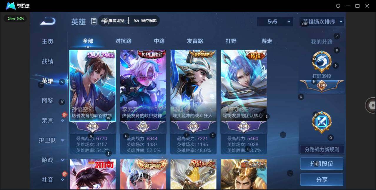 实名: 可修改 贵族等级: V10 英雄数: 127 皮肤数: 397 荣耀水