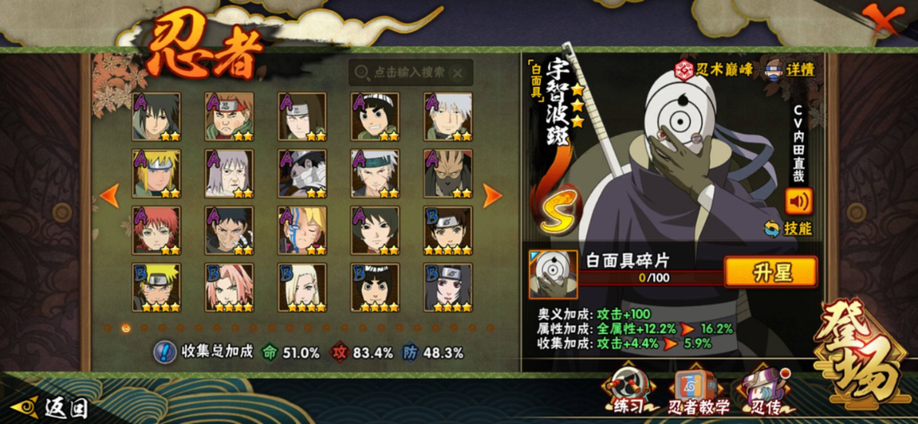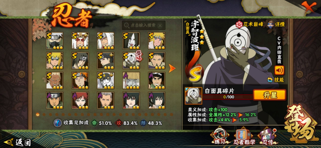 【S级忍者】宇智波带土「忍界大战」(3星),旗木卡卡西「须佐能乎」(3星),自来也「传说中的三忍」(3星),大筒木桃式(3星),艾「忍界大战」(3星),宇智波止水「须佐能乎」(3星