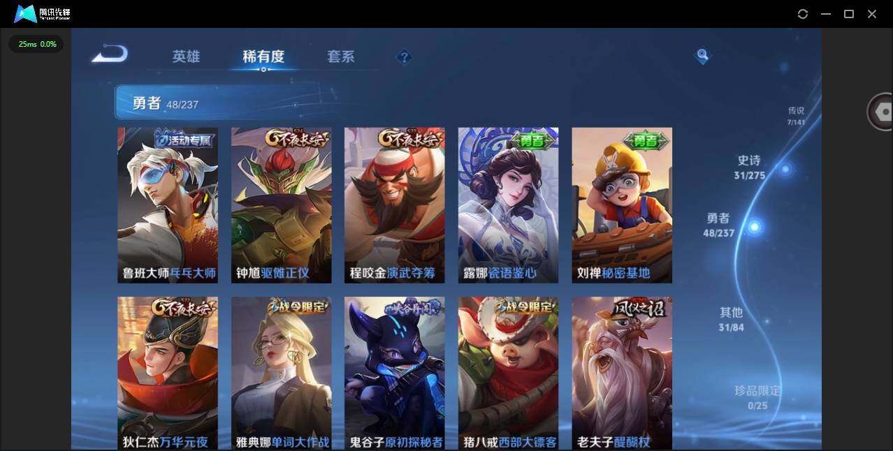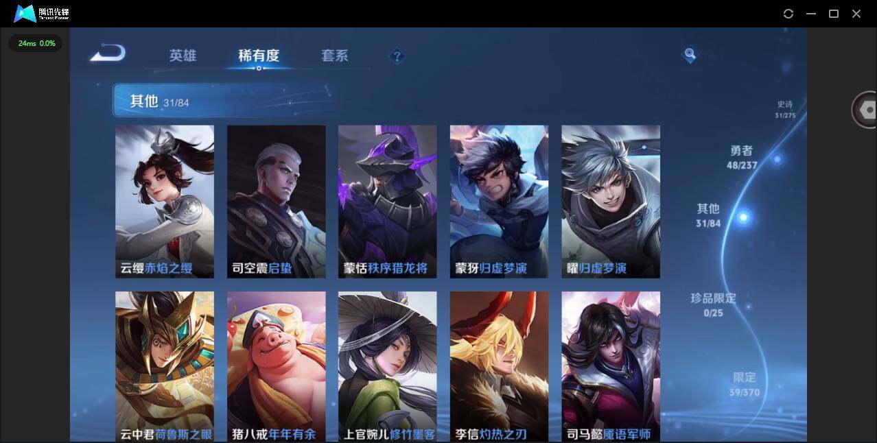 实名: 可修改 贵族等级: V7 英雄数: 105 皮肤数: 117 传说皮: