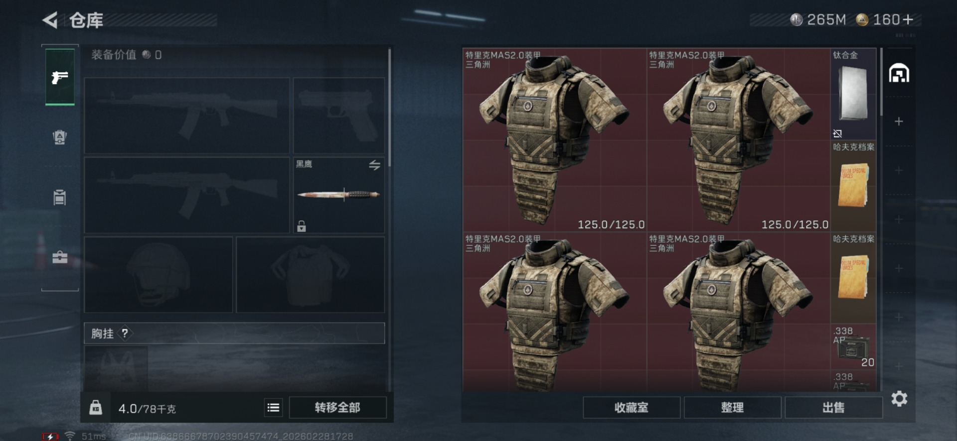 总资产:358.6M 2干员外观 16传说枪械 哈夫币:265K